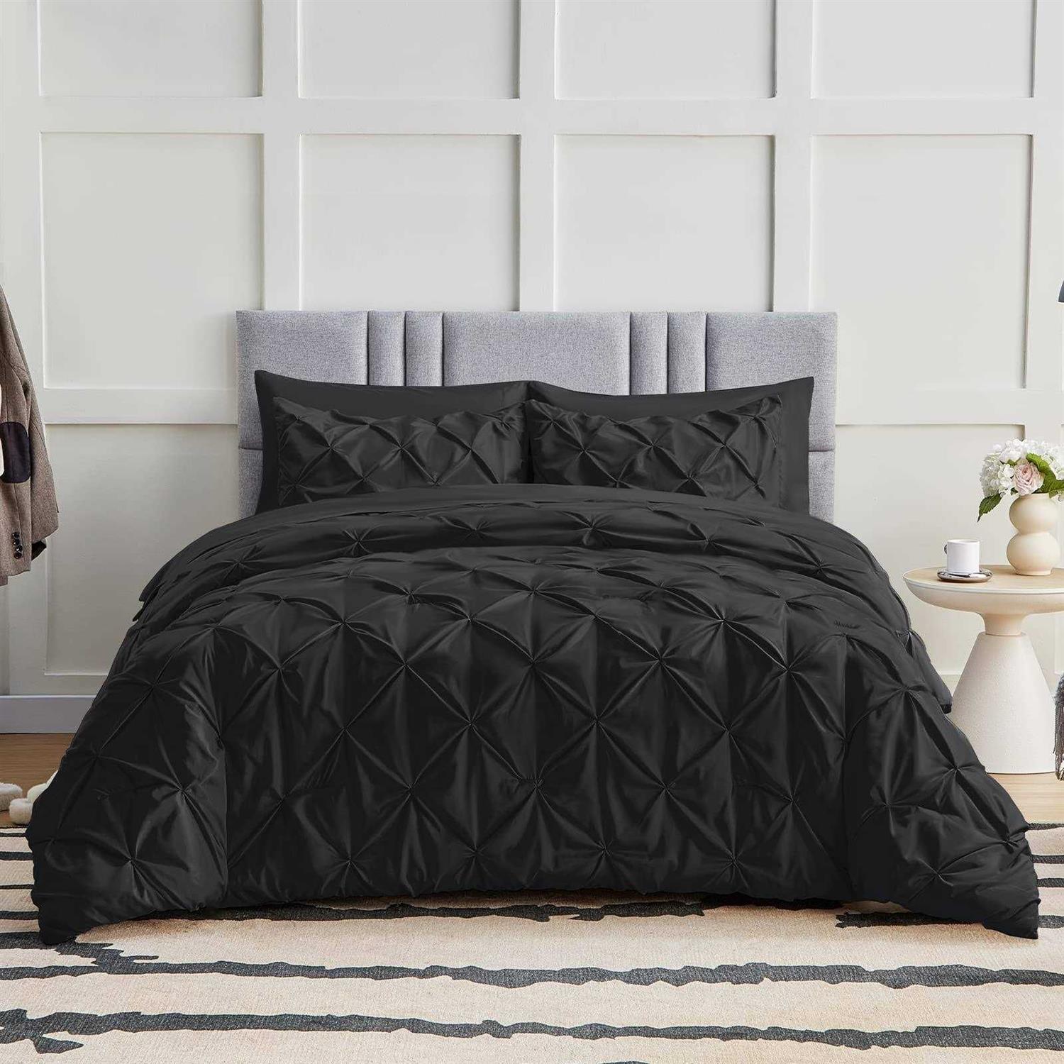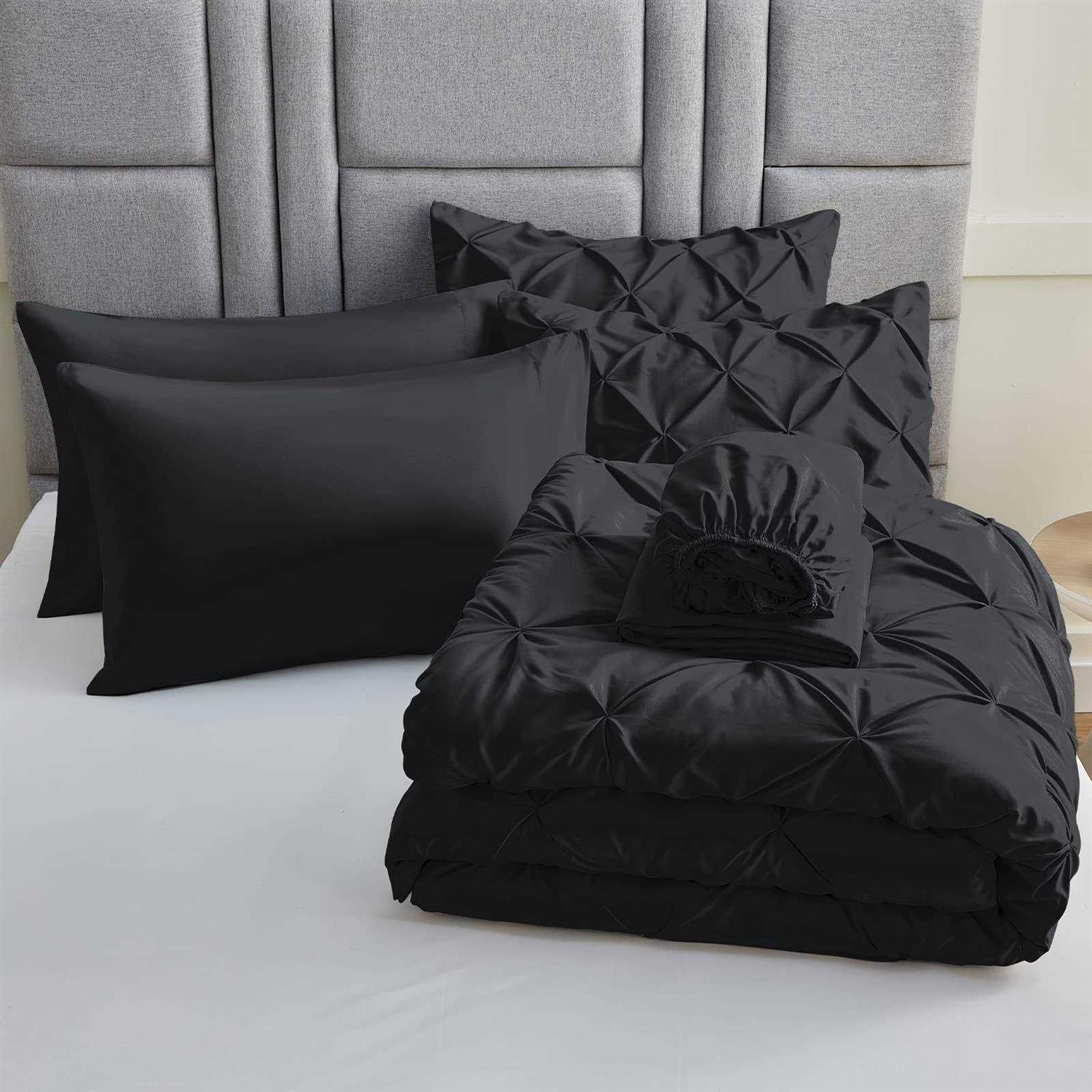 Fashionable Decoration: Pinch Pleat Bed in a Bag Set create exquisite geometric patterns and look more than stunning that elevate your space with modern and noble elements. it provides timeless elegance and fashion to your bedroom decor. Soft and Breathable: The full/queen pinch pleat comforter sets have premium microfiber fabric which is breathable and sweat-absorbent. And also the comforter is filled with extremely soft down alternative microfiber which is friendly to those sneezing with goose down and feather bedding; Experience a fabulous night’s rest with our sets Elaborate Design: The elastic deep pocket fitted sheet fits mattress max up to 16″ deep. That can always keep non-slip no matter how you twist and turn in your bed. The comforter features durable box stitching which offers sophisticated look alongside simplicity and will also stable inside filling What You Can Get: Full/Queen Size bed in a bag includes 1 Comforter 88″x88″, 2 Pillow Shams 20″x26″, 1 Flat Sheet 90″x102″ , 1 Fitted Sheet 60″x80″+14″ and 2 Pillowcase 20″x30″. Our bed in a bag is packaged in a vacuum bag, so you can dry it in low heat or tap the comforter gently while baking it in the sun to fluffy again Easy Care: The bedding sets are machine washable which can save you more time and energy. For year round softness and prevent pilling up, it’s highly recommend to wash it in the gentle cycle with cold water, sun-dry or tumble dry in low when needed. Let our comforter sheets keep providing you and your family with cozy sleeping p CozyLux Pintuck Bed in a Bag is a great gift idea for all your loved ones on special occasions! It features ultra-soft and breathable microfiber brings you a comfortable sleeping experience. The fluffy comforter is filled with breathable down alternative microfiber and also the deep pocket design fixes your fitted sheet firmly on the mattress. Have a good night with your families in our comforter sets! – br – NOTES: /b Since bed in a bag is vacuum packaged, it may not be able to fluff up when you first open it. You may put it into your dryer or expose it to sunlight for a couple of hours, then it will fluff up nicely – br – Specifications: /b – Bed in a Bag Measurement: – 1 Full/Queen Comforter: 88″ W x 88″ L – 1 Queen Fitted Sheet: 60″ W x 80″ L +14″ – 1 Queen Flat Sheet: 90″ W x 102″ L – 2 Pillow Shams: 20″ W x 26″ L – 2 Pillowcases: 20″ W x 30″ L – Package weight: 10.56 lbs – Color: Black – Material:100% Microfiber – br – 100% Satisfactory Service /b – Our CozyLux Team is devoted to offering you the best sleeping experience every night and focus on improving our technology to ensure you bring you more comfortable and cozy. Don’t hesitate to make a CozyLux order! /p