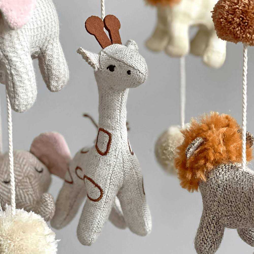 - NURSERY ESSENTIAL: Handcrafted pom-poms and safari animals delicately hover over your little one’s crib or playpen to help encourage curiosity