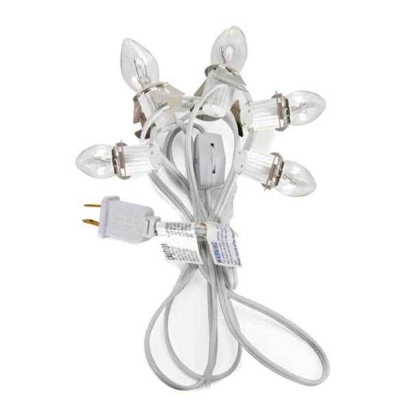 Extension Cords by Creative Hobbies. Absolutely no wiring experience needed! These cords make it easy to light up small villages, christmas scenes, pumpkins, night lights, and more. Completely assembled with On/Off Switch and molded end plug- ready to use! Sockets are candelabra base light bulbs and clip into any hole 1″ in diameter. White SPT-1 cord length is 6 feet long. On/off switch is 18″ from the plug end. The light bulbs are 5 watt, clear, steady burning candelabra base.