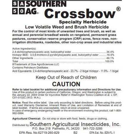 Crossbow specialty herbicide controls unwanted trees, brush, vines, annual and perennial broadleaf weeds, and other woody plants. Ideal for use in rangeland, pastures, and other non-crop areas. Do not use on Bentgrass, St. Augustine grass, Centipede grass, or newly seeded grass. No grazing restrictions following application except for lactating dairy animals. Concentrated formula. Active Ingredient: 2,4-Dichlorophenoxyacetic Acid. Glyphosate-free.