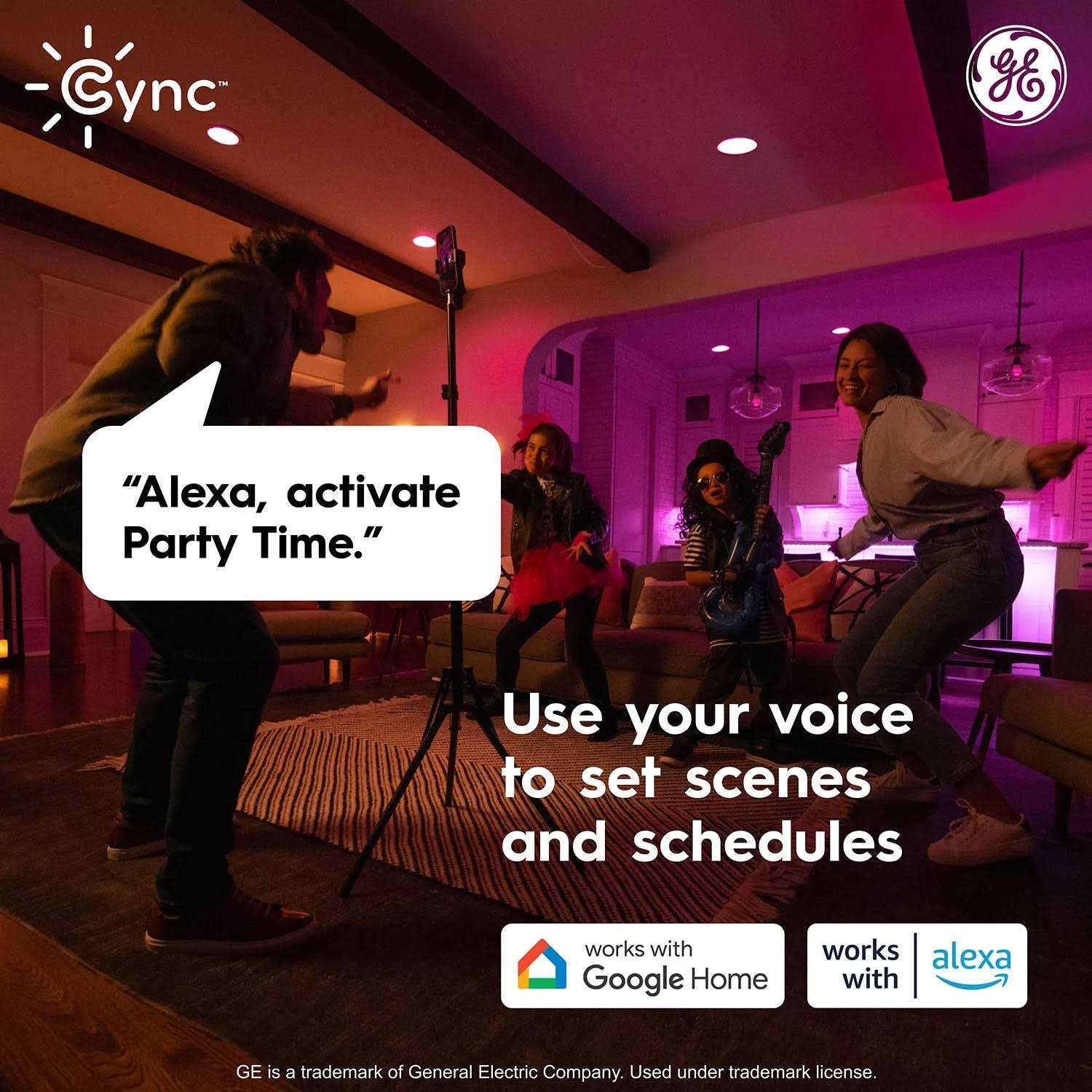 With Cync Full Color Smart Recessed Can Retrofit, you can transform traditional recessed can fixtures from outdated to sleek and convenient. These downlights feature millions of colors to decorate for the holidays, set the ultimate party vibe or celebrate your team on game day. The tunable white spectrum supports your sleep/wake cycle and creates the perfect scene for winding down or waking up. Use the reveal setting for pure, clean light. Reveal lighting is perfect for areas where clarity matters most, like kitchens, bathrooms and craft spaces, and helps make colors pop and whites whiter. The low-profile design seamlessly blends into ceilings for a sleek, modern look. These downlights install like a light bulb—simply screw the base into an existing medium base socket and connect to the Cync App. Pair it with an Amazon Alexa or Google Assistant device for hands-free control with your voice. You can also control your lights away from home without a hub, so you are in control at work or while on vacation. Set your lights on a schedule to turn on at dusk and off at dawn for added security and so you never come home to a dark house. The Cync Full Color Smart Recessed Can Retrofit combines high light quality and high brightness with the convenience of smart home control.