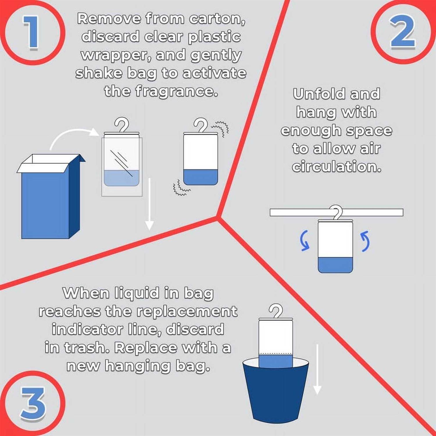 DampRid Hanging Bag Moisture Absorber attracts and traps excess moisture. The time-release fragrance technology releases a pleasant scent continuously over the life of the product. The hanging bag design is perfect for closets, laundry rooms, and storage areas where clothes often collect unpleasant odors. With 10% more moisture absorbing power*, DampRid lasts longer to absorb excess moisture, creating and maintaining the optimal humidity level wherever moisture is a problem. Each dehumidifying bag can last up to 60 days depending on the level of humidity and temperature. When the bag is finished, simply discard and replace. Not for use in moving vehicles. Keep out of reach of children. Read & follow all label directions. *Compared to 14-oz. bag.