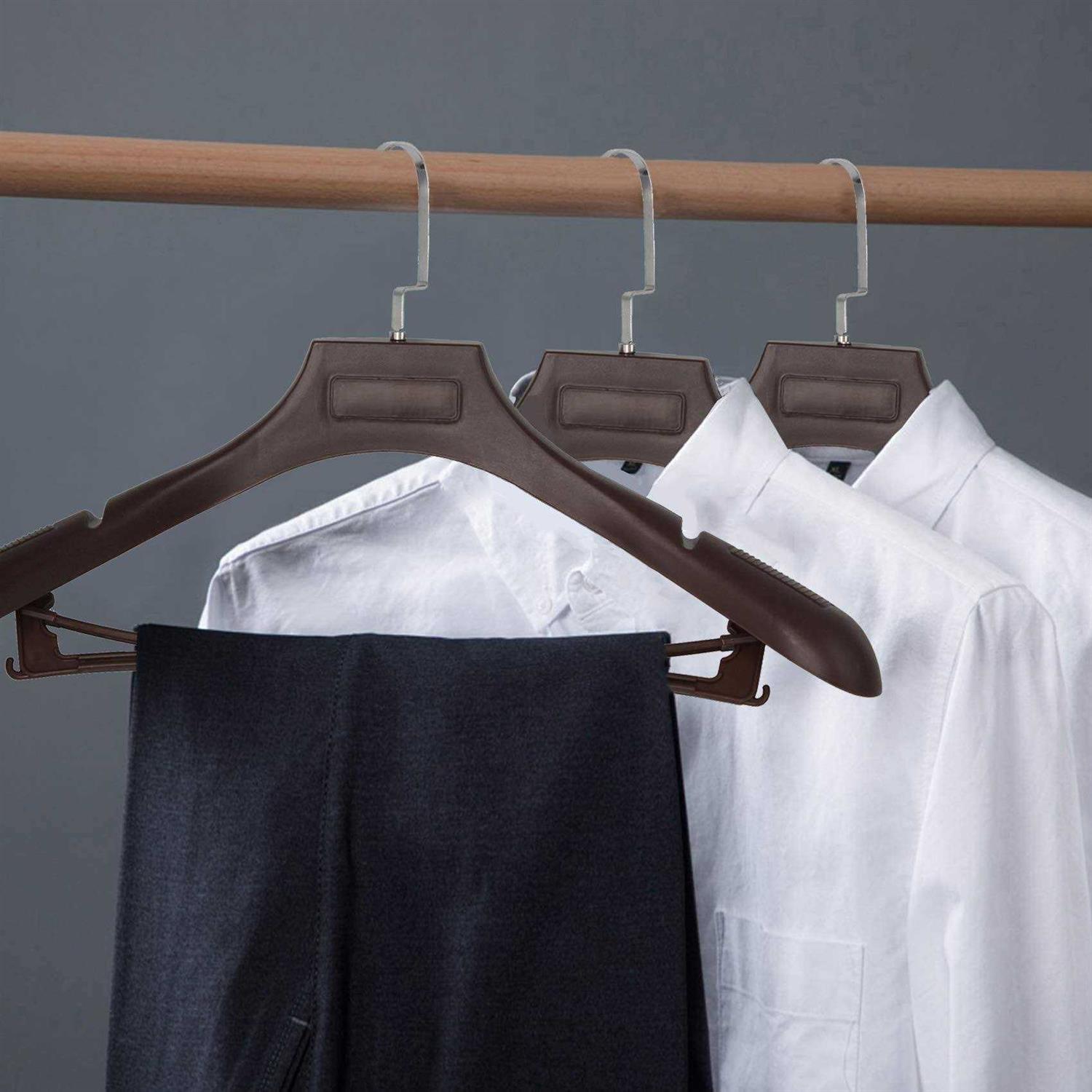 Suit Hangers by DEDU. Swivel hooks easy to use and can support most suits, shirts, dresses and so on. Below the shoulder is a pants rack that can be used to hang pants, scarves, ties, etc.The extra mini hooks can hold small articles like tie. Suitable for all kinds of heavy coats, shirts and so on.