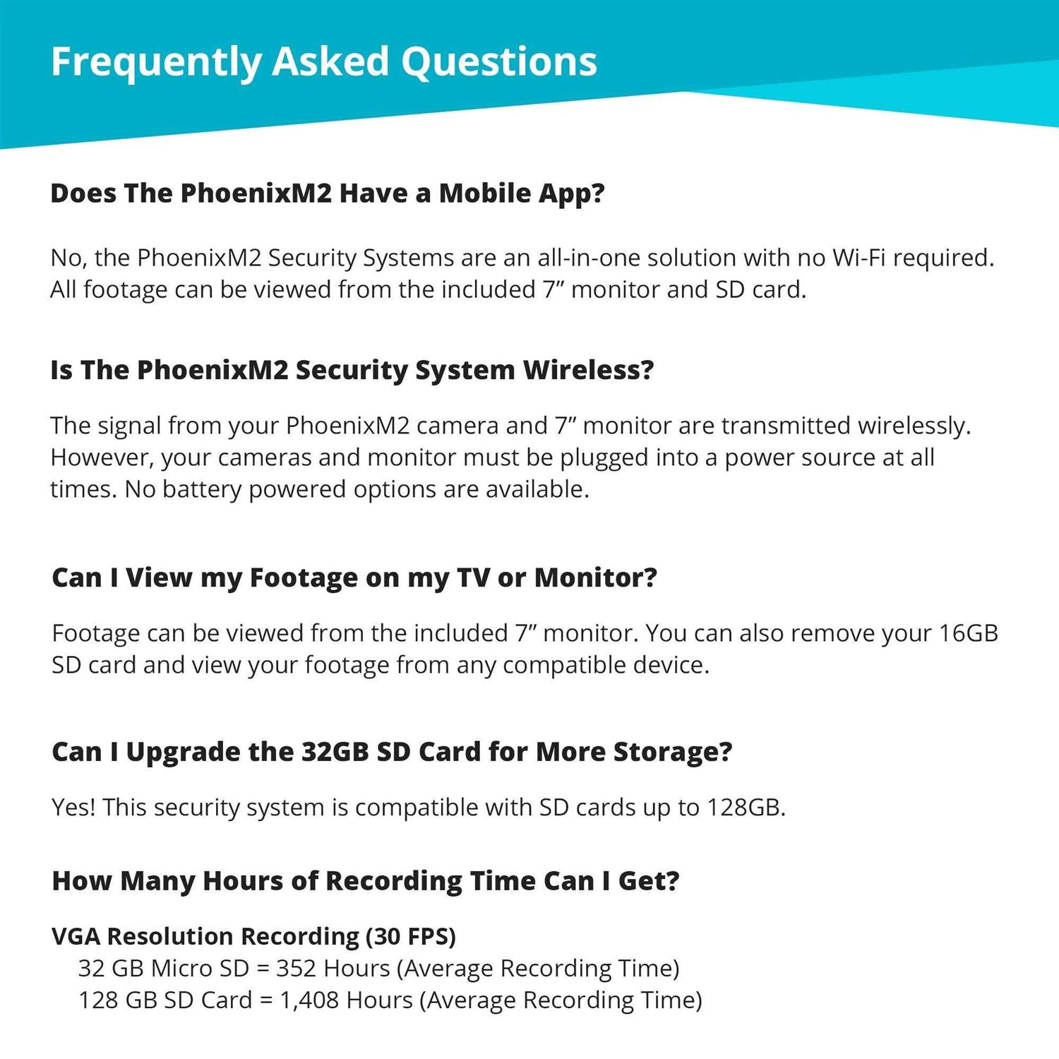 Digital Wireless Technology Using superior digital wireless functionality, the PhoenixM2 system maintains a clear and strong signal up to 450′ away. Easily view your footage on the 7″ screen in full, split or quad-screen view. Record Only What You Need Flexible recording options allow you to record continuously, create a schedule or set motion detection. Record up to 8GB of audio/video footage on the included SD Card. Expandable up to 128GB SD Card. 24/7 Monitoring Built for indoor and outdoor use with a durable aluminum housing, this security system will help you feel protected 24 hours a day. Each camera is equipped with night vision that lets you see up to 40′ in complete darkness. Two-Way Intercom With a microphone built-in to the camera and monitor, the system lets you safely communicate with others anywhere on your property. Expandable This system is expandable up to four cameras, you can build out your preferred monitoring experience.
