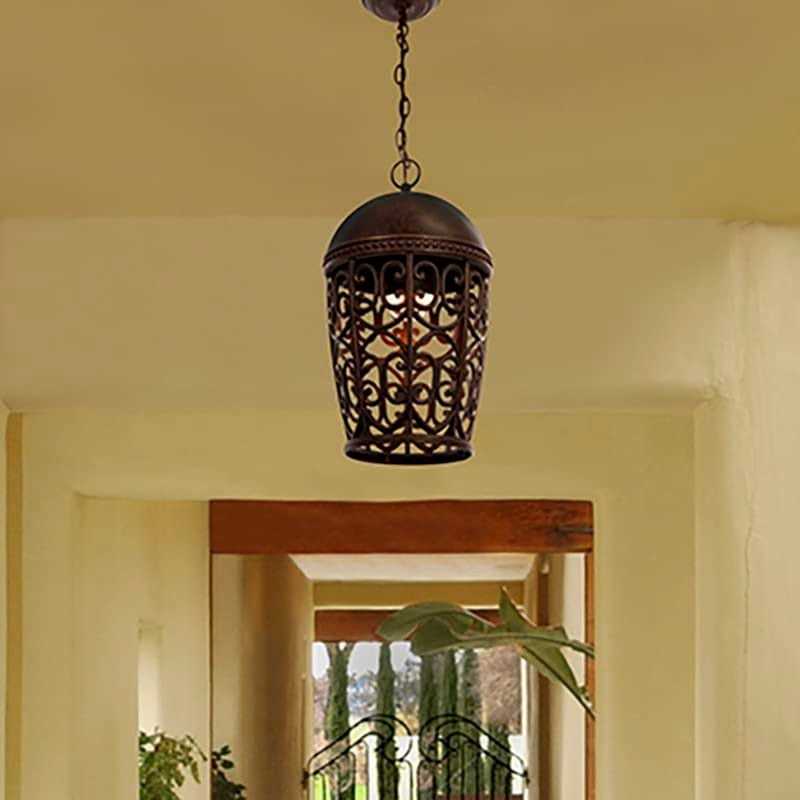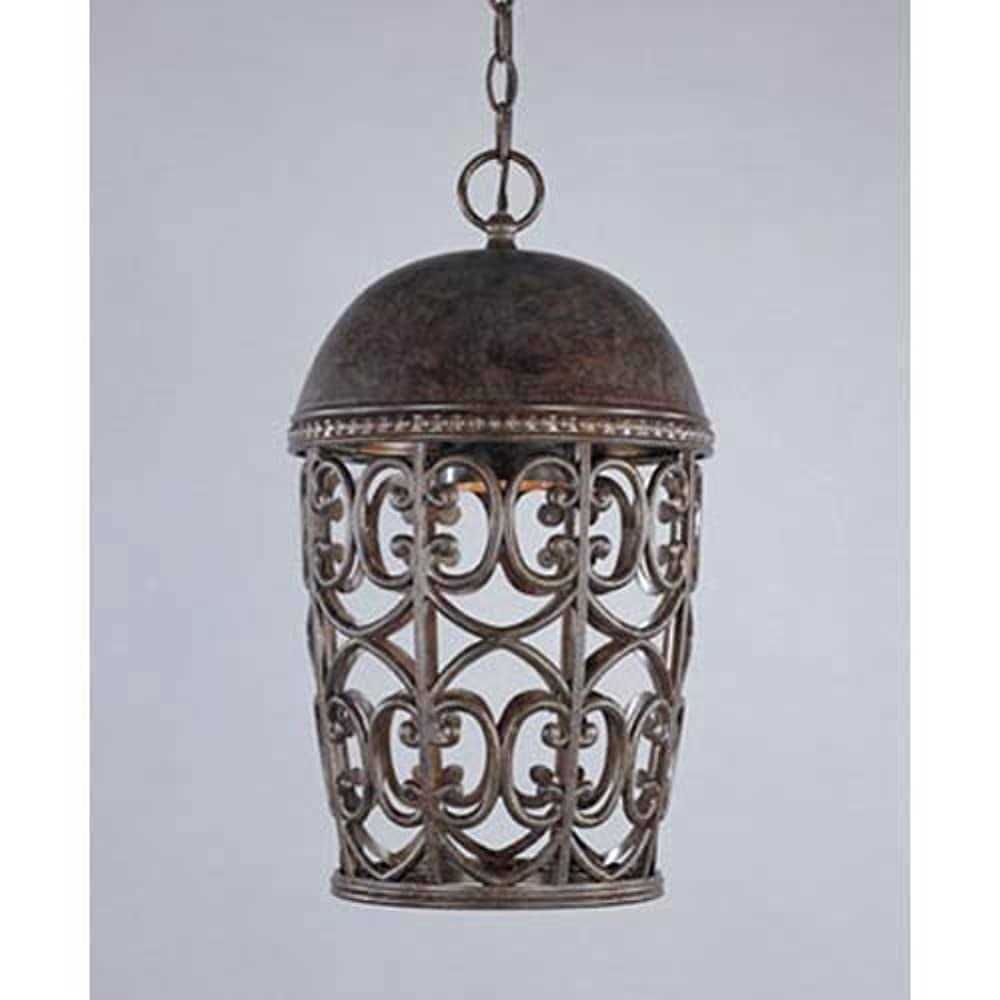 Beneath the beautiful dome top of this cast aluminum hanging outdoor light is a wonderful cylinder grill of elegant scroll work. Finished in warm burnt umber this no-glass Dark Sky compliant one-light fixture hangs from an adjustable matching chain. A charming addition to an inviting traditional coastal or country style home from Designer’s Fountain.