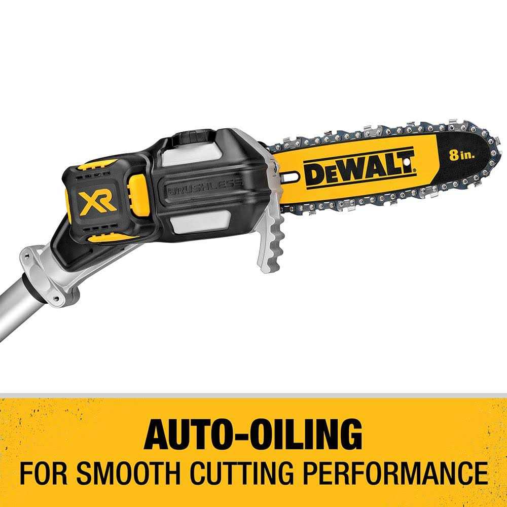 The 20V MAX XR Brushless Cordless Pole Saw comes equipped with an 8 in. bar and chain and features a high-efficiency brushless motor that delivers up to 96 cuts per charge. The well-balanced, durable pole shaft extends up to 10 ft. for a total reach of 15 ft. It has an auto oiling feature for added convenience and time savings. It also features metal bucking strips for a durable cutting grip and a tree hook allows you to easily remove pruned branches.