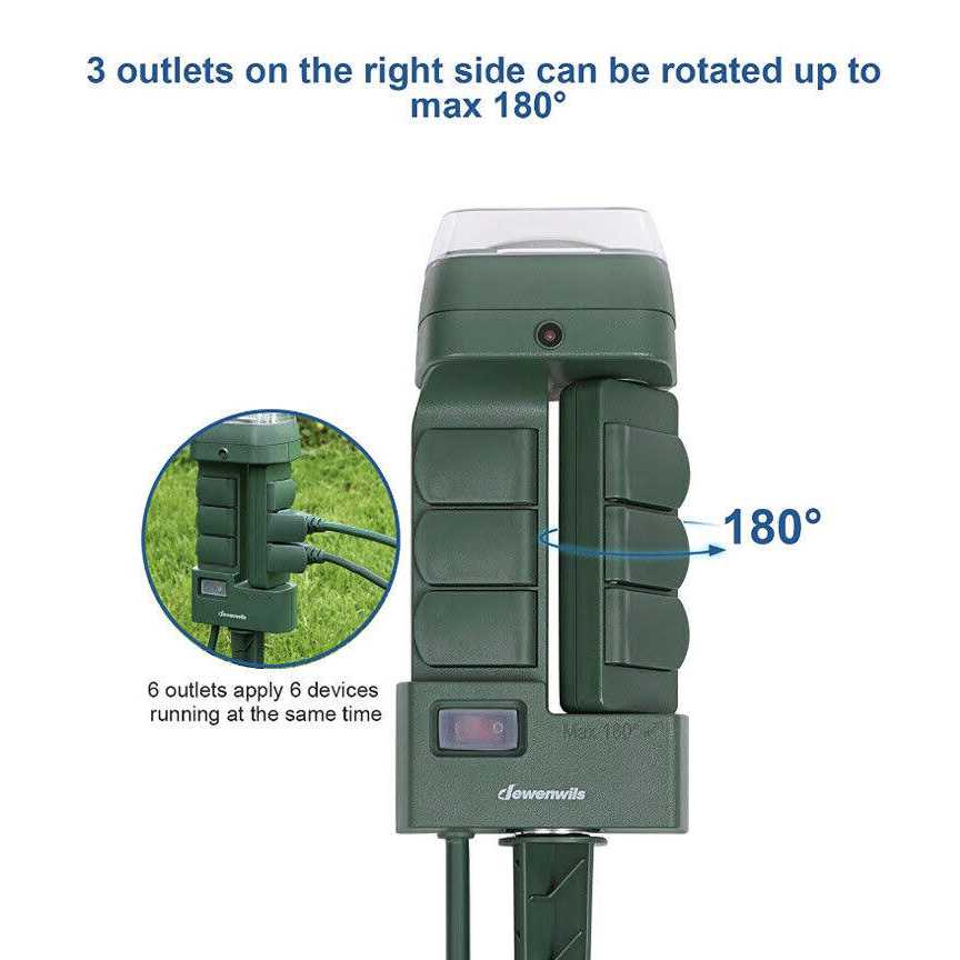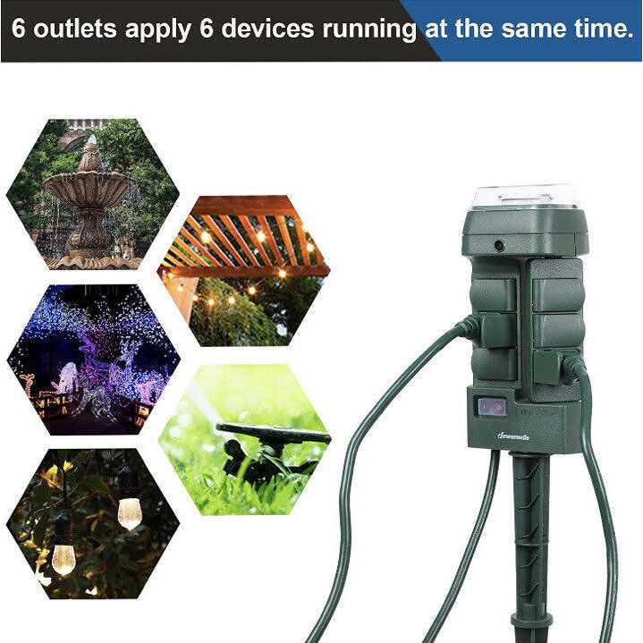 Timers by DEWENWILS. Details:How many times have you forgotten to turn off your lights in the backyard? Are you tired of going out and turning off/on your Christmas lights? With DEWENWILS yard stake timer switch, you can turn your yard lights, patio or seasonal decorations on a set schedule every day. This timer features a durable, weatherproof construction. Program for pool pumps, outdoor landscaping, holiday lights, and other heavy-duty appliances. Mechanical Programmable Timer 30-minute intervals, 48 setting options one day, set once and repeats daily. Safe and Weatherproof Design Durable and weatherproof material for outdoor use; the overload protection is designed to protect it from short-circuits / over-current / over-voltage / over-heating of all the devices on the outlet. Energy Saving You can turn off/on lights and other home electric appliances automatically to eliminate wasteful standby power, save energy and reduce your electricity bill. Blending Color The dark green…