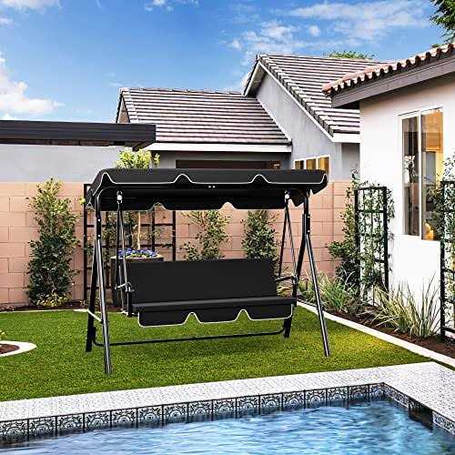 ADJUSTABLE CANOPY- The canopy can be rotated to any angle for optimal shade coverage and avoid direct sun exposure IMMENSE WEIGHT CAPACITY- Heavy duty steel spring lock allows our swing chair to hold up to 529lbs.; 52” swing bench boasts enough space to accommodate three people to comfortably swing and relax together STURDY & DURABLE- The unique triangular construction design and heavy spring hook ensure the swing stable and safety, powder-coated steel tubing can extended longevity and enjoy. Let you rest assured to use REMOVABLE SEAT CUSHION- Soft seat and back cushions enhance comfort; Removable design for easy cleaning and storage, suitable for all seasons VERSATILE APPLICATIONS- This 3-seat swing chair is ideal for home use; Enjoy outdoor leisure time on patios, decks, backyards, rooftops, and more. Safety measures and professional installation are highly recommended.