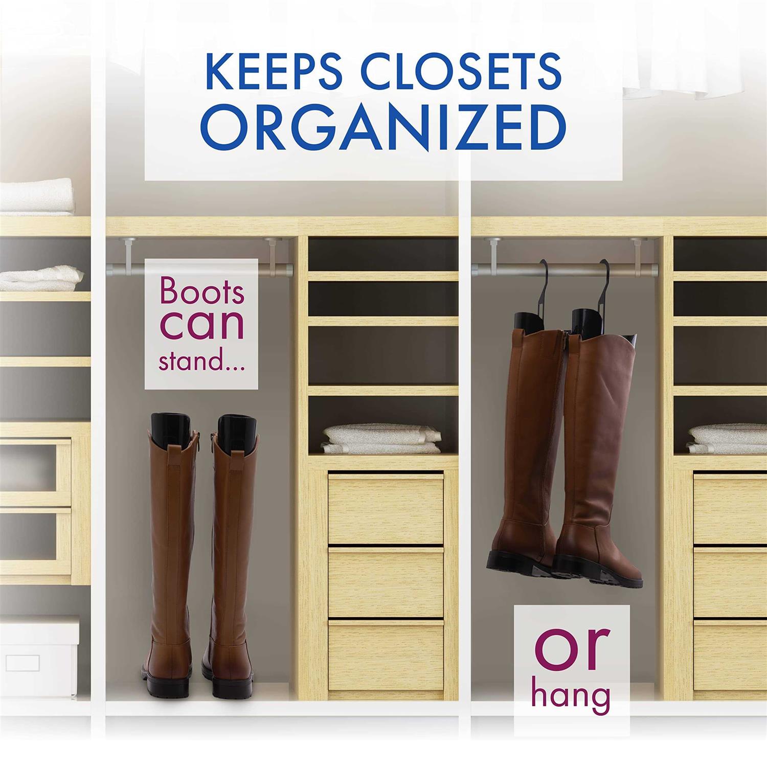 The days of misshapen boots bundled up at the bottom of your closet are over. Simply squeeze these boot shapers together to insert them in your favorite pair of tall shafted boots. The sturdy construction of the Women’s Boot Shapers will retain the shape of your boots and keep them looking like new. Prevents cracks and creases in leather and vinyl bots. Convenient hook allows you to hang the boots from a closet rod. One size fits all. Measures 5.75″ L x 2.25″ W x 12.5″ L.