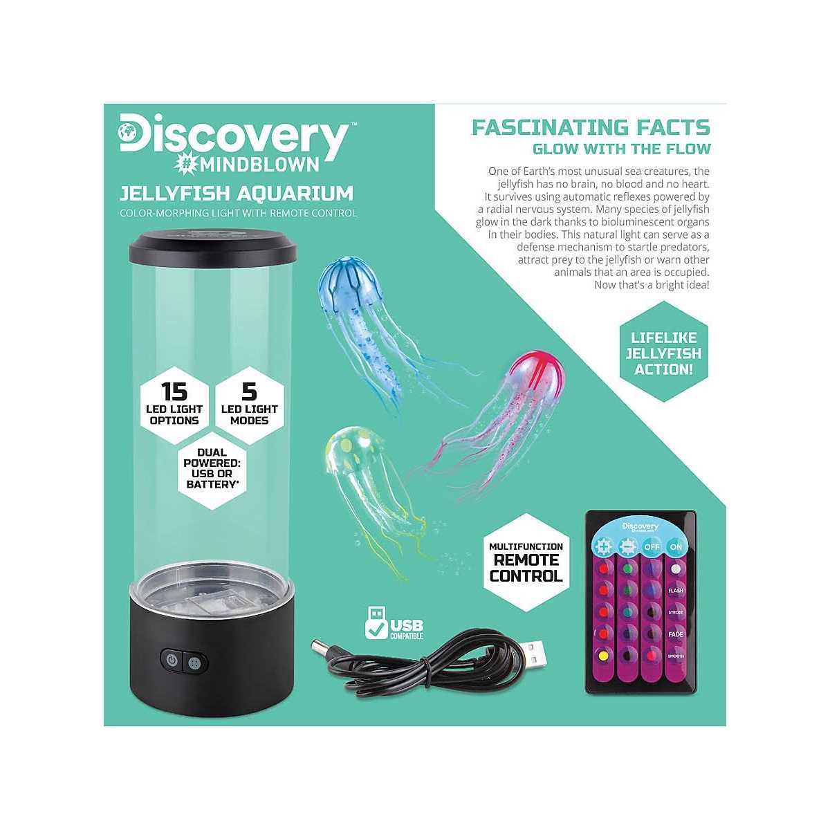 Discovery #Mindblown Jellyfish Aquarium is a fun and educational way for your child to observe realistic sea life at home. Customize the ambiance of the room by adjusting the aquariums lighting to your color preference by choosing any of the 15 lighting options and 5 light modes. You and your child will watch in amazement as lifelike jellyfish gently float through a sea of morphing LED lights that you control with the included remote. The aquarium features two ways to power the LED lights: plug it in with the included USB cable or insert 4 AA batteries.