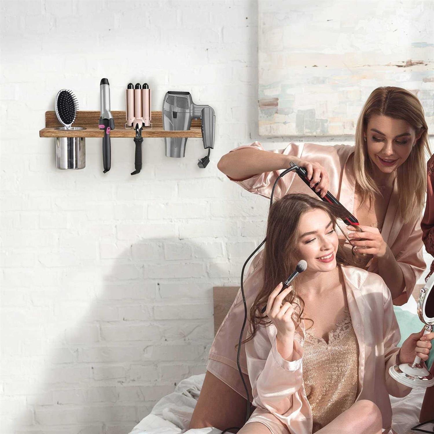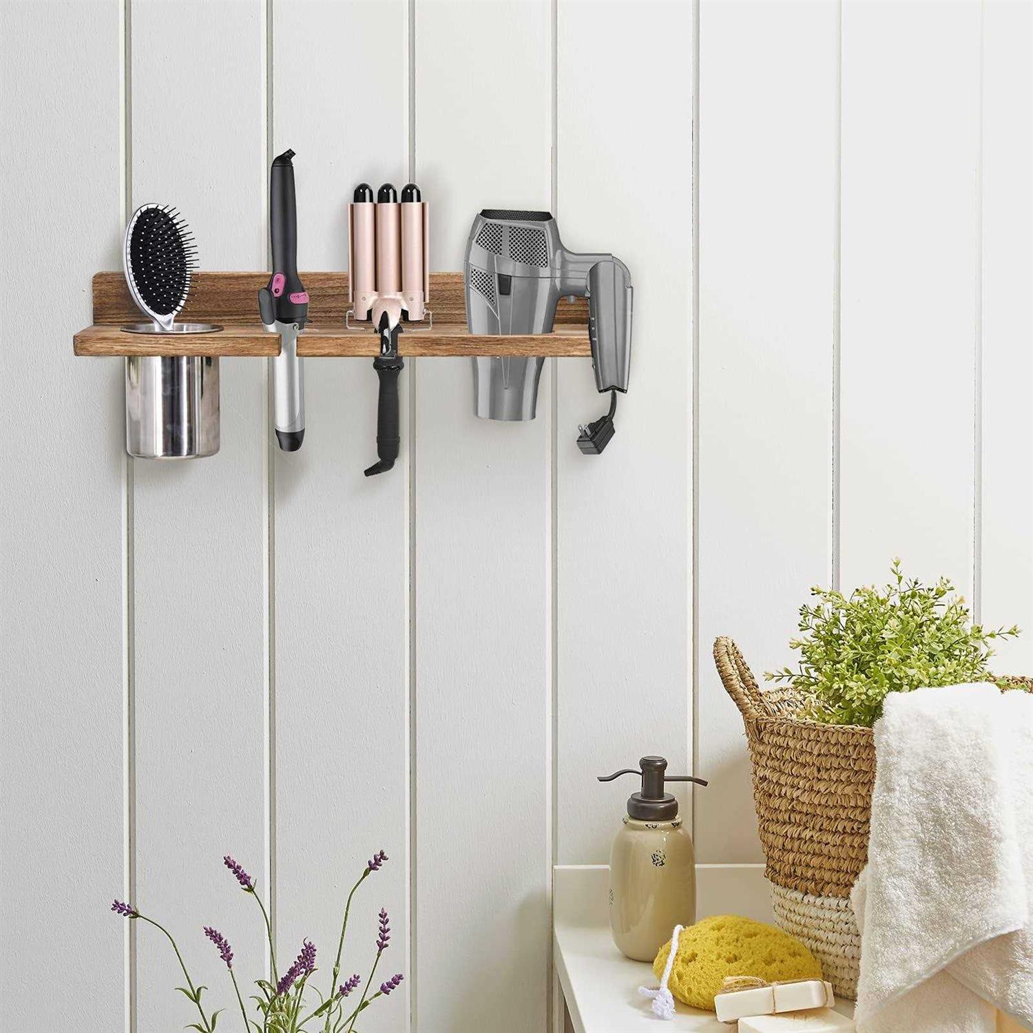 DORAMII Bathroom Wall Mount Hair Dryer Holder Hair Care & Styling Tool Organizer Farmhouse Wooden Beauty Hair Appliance Holder for Flat Iron Curli