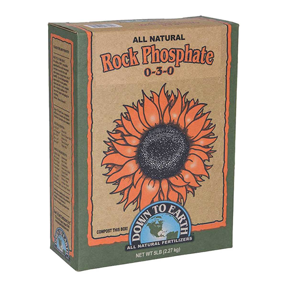 Down to Earths Rock Phosphate is a natural source of Phosphorus and Calcium. Down to Earth Rock Phosphate is a five-pound box of all-natural fertilizer with 0-3-0 formula and is listed by the Organic Materials Review Institute (OMRI) for use in organic production Rock Phosphate has 18% calcium and is essential for building soil phosphate levels for long term plant productivity and for preventing calcium deficient soils Should be applied to soils prior to planting and can be mixed with compost or manures for additional soil building benefits This premium powder grade is an excellent nutrient resource for all types of flowering plants including bulbs, fruits, shrubs, trees and vegetables Soft Rock Phosphate is an untreated, mined material with a natural source of Phosphorus and Calcium that is available more quickly than hard rock phosphate Down To Earth Rock Phosphate is essential for building soil phosphate levels for long-term plant productivity and for preventing calcium deficient soils. It should be applied to soils prior to planting and can be mixed with compost or manures for additional soil building benefits. This premium powder grade is an excellent nutrient resource for all types of flowering plants including bulbs, fruits, shrubs, trees and vegetables.