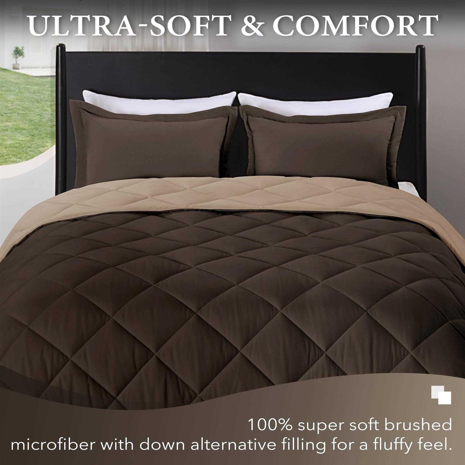 downluxe Lightweight Solid Comforter Set (King) with 2 Pillow Shams – 3-Piece Set – Brown and Tan – Down Alternative Reversible