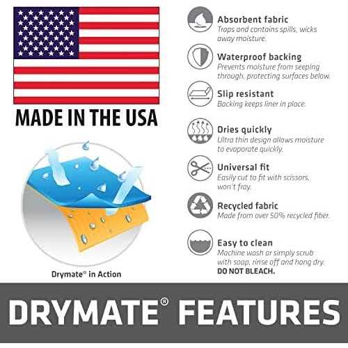Protect your cabinets, shelves, and drawers from water damage, spills, stains, scratches, and more! Drymate Premium Shelf Liners are made with a soft, cushioned material that is perfect for delicate glassware and wet kitchenware. These protective liners can absorb 4x of their weight in liquids and quickly wick away moisture, helping you save time when unloading the dishwasher! Features a waterproof & slip-resistant backing to prevent soak-through and keep the liner securely in place. These liners can easily be cut to fit any shelf or drawer, are machine washable, and are made in the USA from over 50% recycled materials (BPA, PFAS, and Phthalate-free). To clean simply rinse off and hand wash with a mild detergent, then hang to dry. If machine washing – wash separately on a delicate cycle, then hang to dry. Do not put in dryer or bleach.