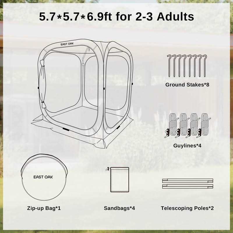 Pop-up & Easy to Setup or Storage: EAST OAK pop-up screen tent for 2-3 adults is portable and can be set up by a single person in about one minute. Designed to be easily folded, the tent comes with a convenient carrying bag. Its dimensions are 31.5*3.2*31.5 inches, making it easy to store. Comfortable & Ventilated Space: UPF 50+ anti-UV protection and silver-plated coating on the top effectively insulate heat. Oversized fine mesh design, excellent ventilation. With the bottom fabric design, if you can bury the edge of the bottom fabric in soil or rocks, it really helps keep bugs out and keeps the screen house anchored. Upgrade to a higher ceiling so space is larger, and the user experience is better. Durable & User-friendly Design: This screen room is made of durable and high-quality materials, with fiberglass support poles at the top, 300D high-strength Oxford cloth on the edges, galvanized flat steel on the inside, double-sided zippers, and curtain which can
