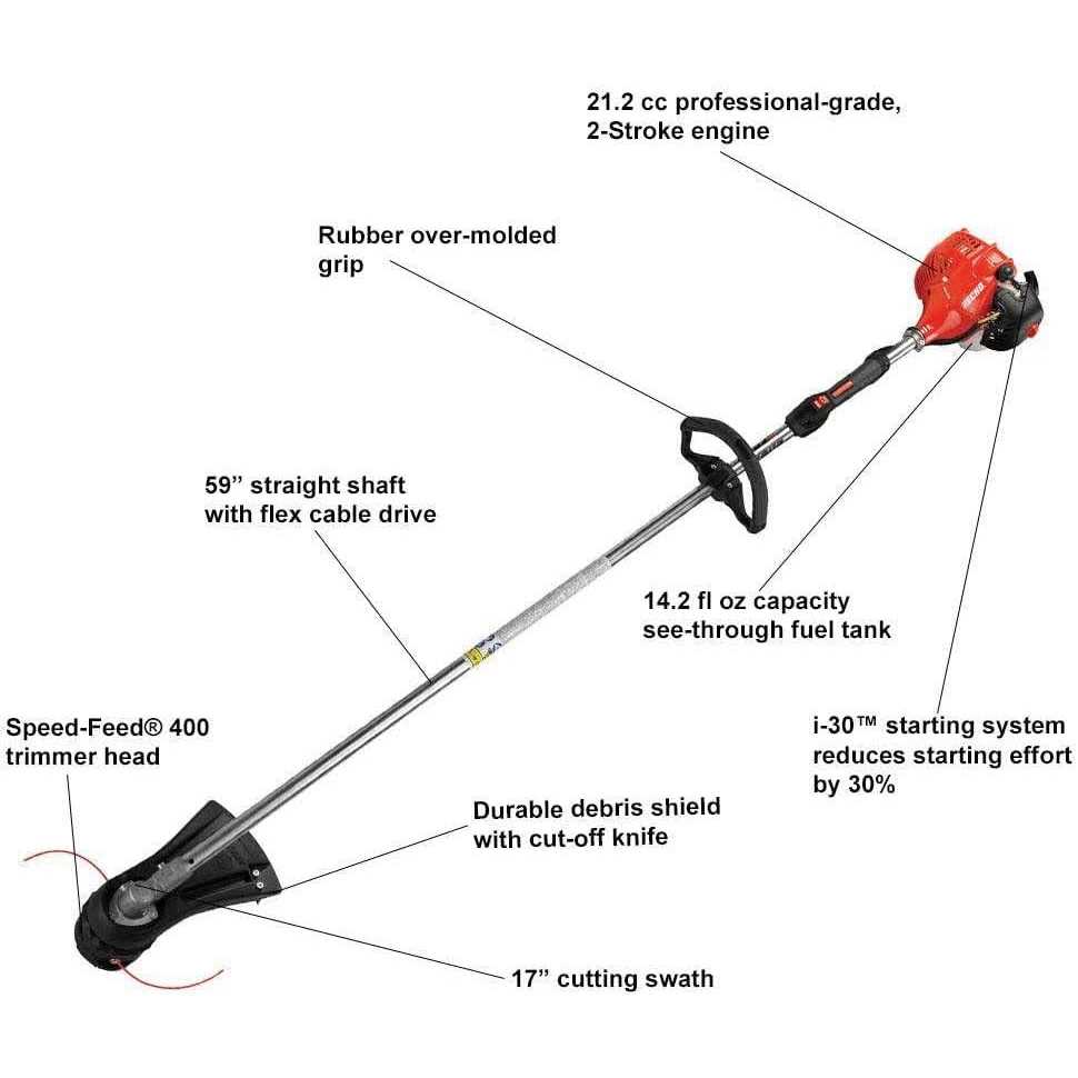 Get the quality look you want when cutting grass and weeds with the ECHO 21.2cc Straight Shaft Trimmer with i-30Â Starter. Thanks to its i-30Â starting system, turning the device on and starting your work is almost entirely effortless. The Echo 21.2cc straight shaft trimmer boasts a 2-stroke engine, providing you with the high-quality performance you expect. The professional-grade air filtration system helps improve the durability and lifespan of the engine. Maintenance of the air filter requires no tools with the tool-less cover. For user comfort, the Echo straight shaft gas trimmer features an engine vibration system that helps reduce vibration during use. It also comes with an ergonomic rubber handle that helps ensure comfortable use. Reloads are quick and easy with the Speed-Feed trimmer head. The head features a debris shield with a built-in cut-off knife that keeps your line at the ideal length.