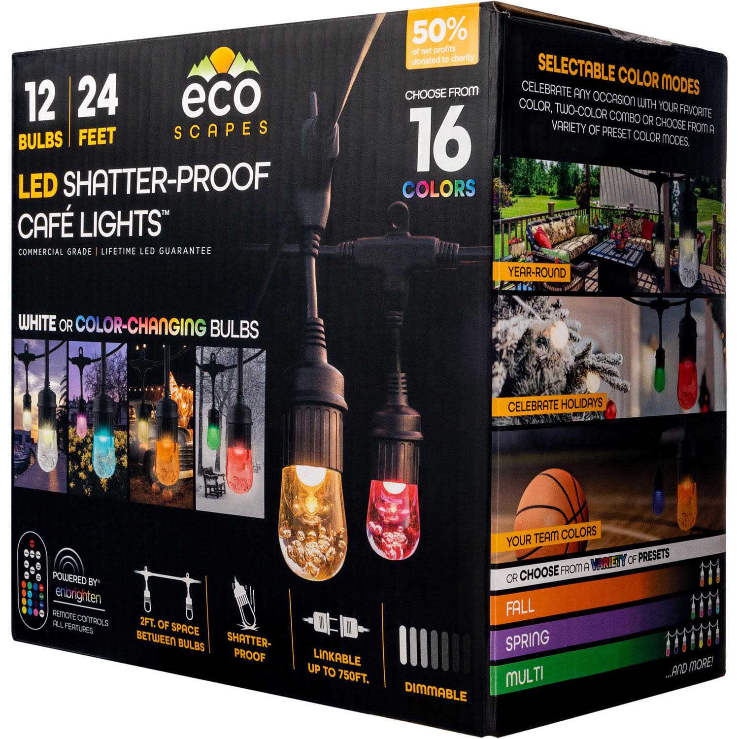 Light the way to a better world with EcoScapes LED Color-Changing Café Lights. These commercial-grade lights will keep your outdoor spaces looking bright, colorful and stylish–all year long. Thanks to environmentally and economically efficient LED technology, you won’t even have to replace a bulb. These high-quality café lights provide you with 16 vibrant colors and different ways to showcase your own personal style. In addition to enjoying a single bold color, you can mix it up with any two-color combination. You can also select from multiple preset color modes to fit any special occasion or holiday such as patriotic red, white and blue, festive fall colors or red and green for the winter season. Simple and Efficient Set-up and operation of the EcoScapes LED Color-Changing Café Lights has been made simple and as hassle-free as possible. Use the included remote to select from several preprogrammed effect modes that include dimming, fading and strobing. If you have a specific timeframe in mind, utilize the built-in two and four-hour timeout feature. Each bulb is made from durable acrylic and designed to withstand impact and severe weather. Flexible mounting keyholes are also specifically designed to allow you have plenty of placement options. Funds a Water Charity Illuminating your home in style with these wonderfully vibrant Café Lights is only a small part of what happens when invest in this product. Your EcoScapes purchase also helps make a difference in the world, as 50% of net proceeds go to support Water4. This 501(coffee) 3 charity is committed to eliminating the world water crisis that impacts nearly 2 billion people and causes hundreds of thousands of preventable deaths each year. Every time your EcoScapes LED Color-Changing Café Lights turn on, it will serve as a small reminder of the people whose lives were made just a little bit easier by your small act of kindness.