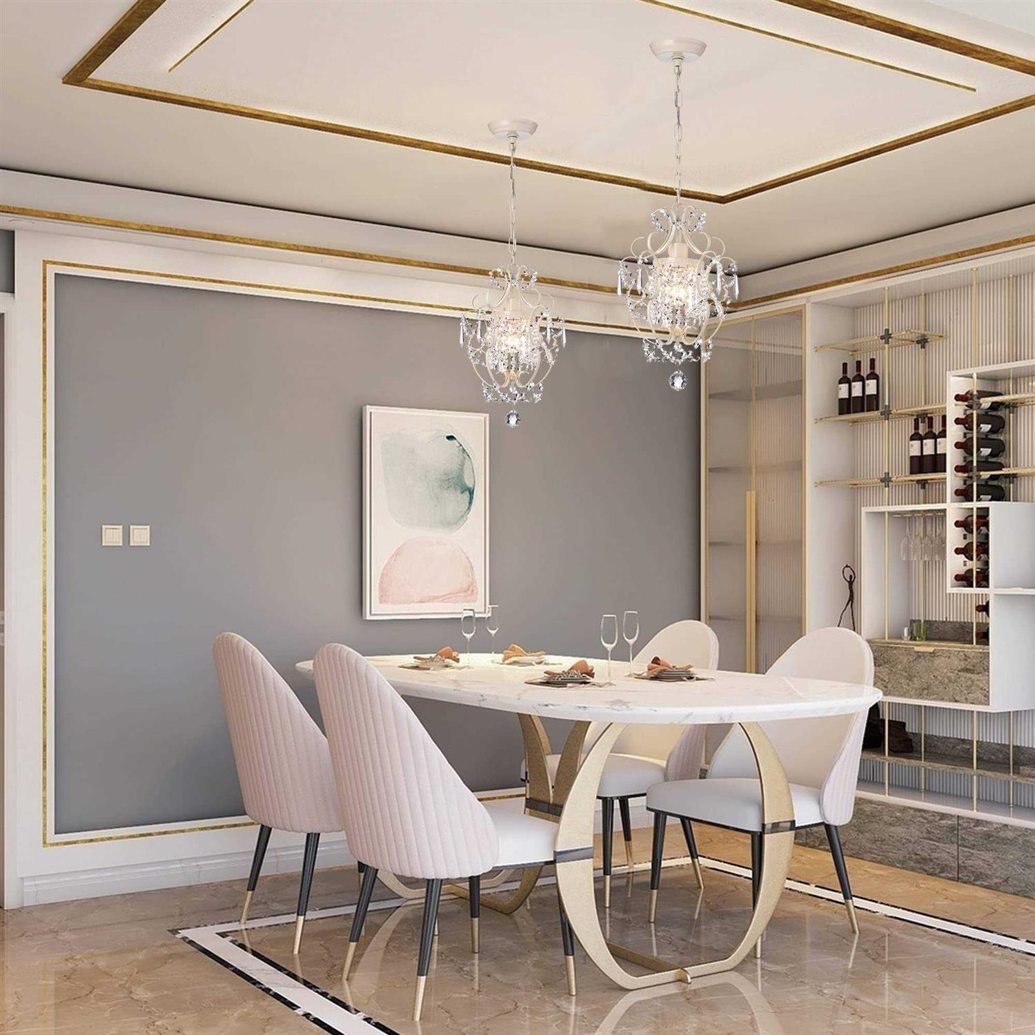 This gorgeous mini chandelier adds elegance to even your small spaces. Strands of intertwining dazzling crystals mix with the white finish hardware and surround the single bulb to make this compact beauty a focal point. It is 15 inches high and comes with a 39-inch adjustable chain.
