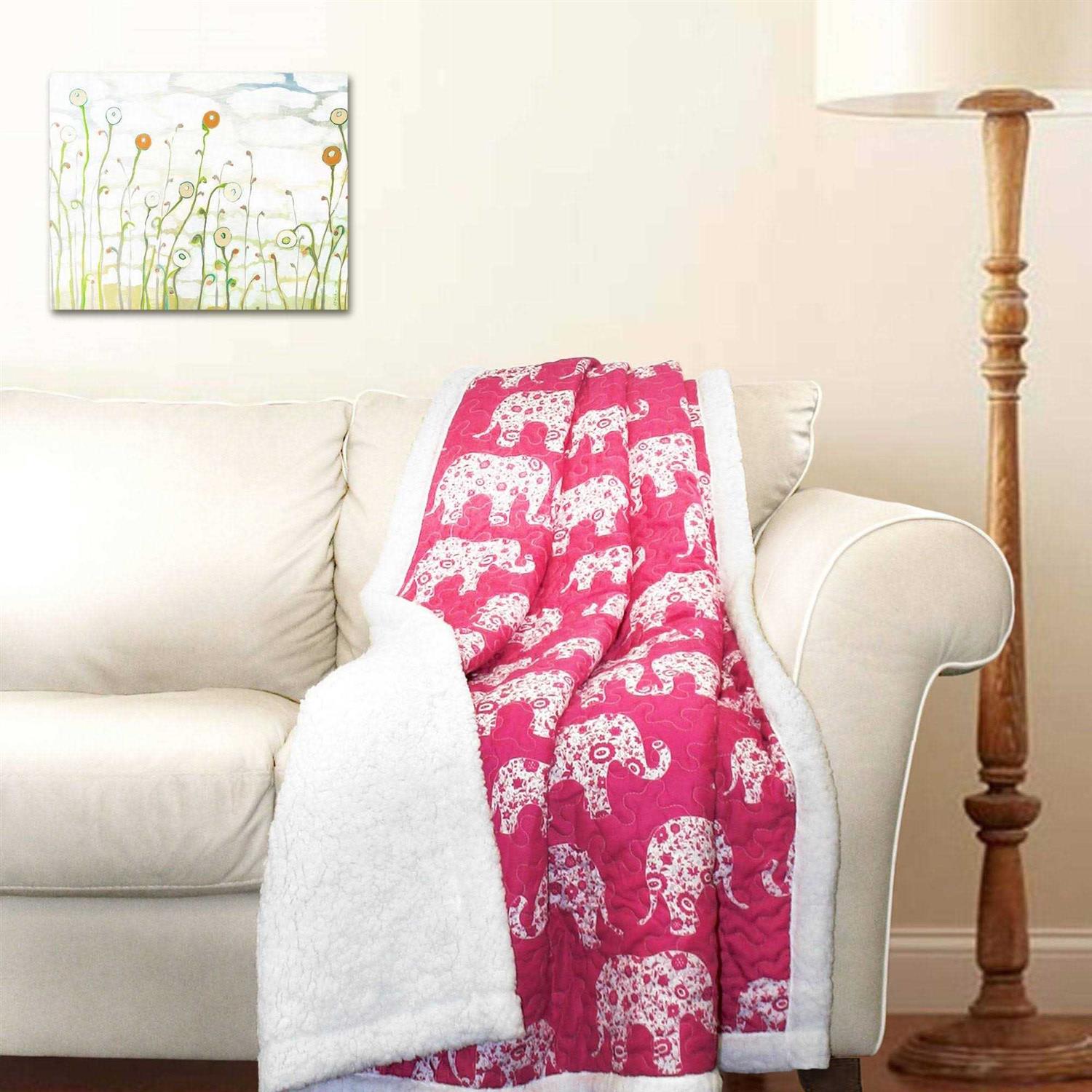 Add some color and whimsy to your linen supply with this Elephant Throw Blanket. It reverses to a plush and comfy sherpa material that is oh so cozy. On a chilly evening, you can stay warm and comfortable with this elephant blanket for adults. It has a parade of white spotted elephants throughout that makes it an eye-catcher. This elephant sherpa throw blanket will add an ideal finishing touch to your living room, den, bedroom or guest room. You can cozy up with it while reading, watching the game or your favorite television show. The sherpa Lush Decor throw blanket is also ideal for car rides, sitting on benches during sports games and drive-in movie theaters. It is made of high-quality microfiber material with a 100 percent polyester fill for optimal comfort. The fabric is machine washable for easy care. This reversible throw is available in assorted colors to help complement your interior decor and personal style.
