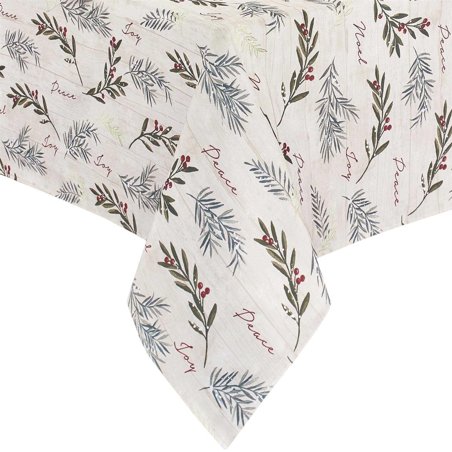 The Holiday Tree Trimmings tablecloth is the perfect solution to your seasonal decorating needs. Holiday design features a shiplap aesthetic with pine needles, branches, berries and holiday wording. Excellent for special occasions, events, parties, family gatherings and everyday use during the holiday season. Soft and durable fabric can be ironed to release stubborn creases and make your tablecloth wrinkle free. Hemmed edge adds a finished look and prevents wear and tear. Available in a large selection of table shapes and sizes including rectangle and round to fit all your entertaining needs. 100% Polyester. Easy care, machine washable. Coordinate to Holiday Tree Trimmings napkins to complete the look.