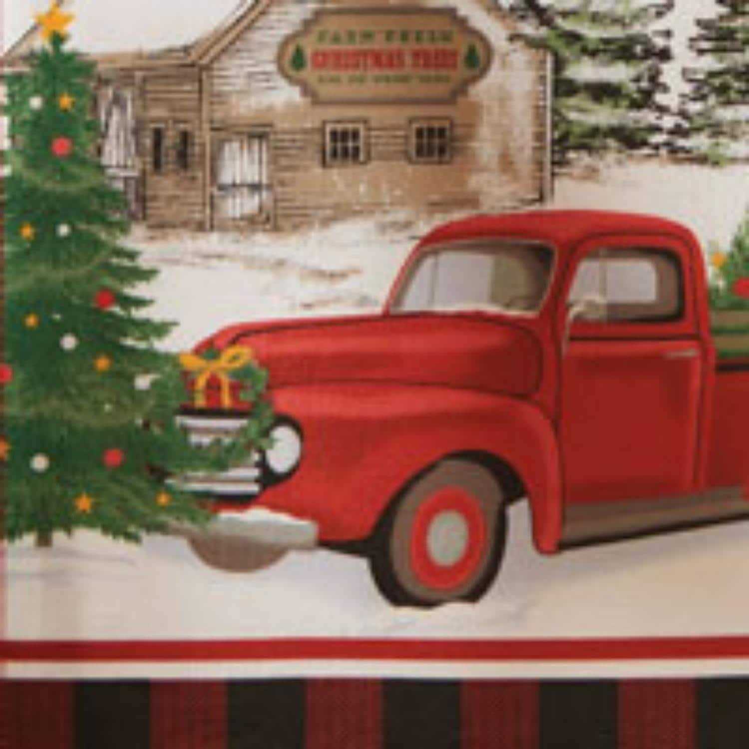 The Vintage Christmas Tree Farm printed tablecloth brings a festive, nostalgic look to your table setting throughout the Christmas and Holiday season. Holiday inspired, decorated with snowmen, evergreen pine trees, a classic red pickup truck and a vintage Christmas tree barn. Features a soft white ground and a red and black buffalo check border design for a rustic farmhouse look. Excellent for special occasions, events, parties, family gatherings and everyday use during the holiday season. Soft and durable fabric can be ironed to release stubborn creases and make your tablecloth wrinkle free. Hemmed edge adds a finished look and prevents wear and tear. Available in a large selection of table shapes and sizes including square, rectangle and round to fit all your entertaining needs. 100% Polyester. Easy care, machine washable. Coordinate to Vintage Christmas Tree Farm napkins, placemats and table runner to complete the look.