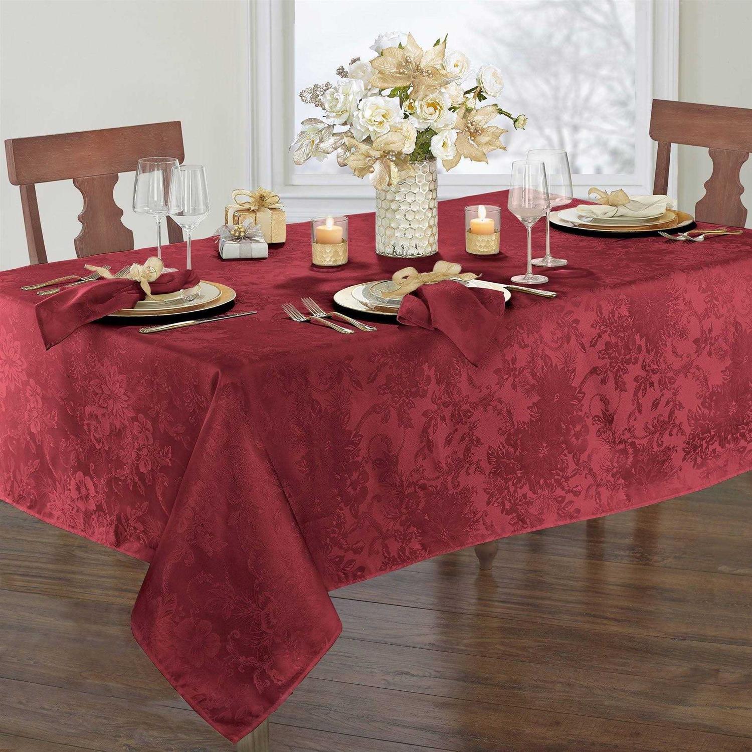 The Poinsettia Elegance Woven tablecloth is the perfect solution to your decorating and table linen needs. Delicately woven jacquard poinsettia design gives it the versatility of a solid, with a touch of fashion. Excellent for special occasions, events, holiday parties, family gatherings and everyday use during the holiday season. This table cloth has the soft hand of an ordinary tablecloth, with the added function you need. Fabric features water and stain repellant finish. Silky fabric can be ironed to release stubborn creases and make your tablecloth wrinkle free. Hemmed edge adds a finished look and prevents wear and tear. Available in a large selection of table shapes and sizes including rectangle and round to fit all your entertaining needs. 100% Polyester. Easy care, machine washable. Coordinate Poinsettia Elegance napkins and placemats to complete the look.
