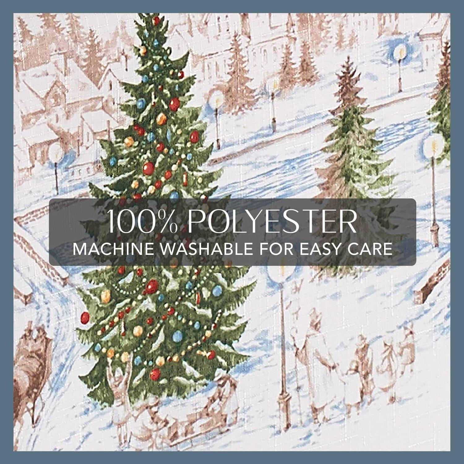 The Santas Snowy Sleighride tablecloth is the perfect solution to your seasonal decorating needs. Double border holiday design features Christmas trees in the snow with Santa and reindeer riding above. Excellent for special occasions, events, parties, family gatherings and everyday use during the holiday season. Soft and durable fabric can be ironed to release stubborn creases and make your tablecloth wrinkle free. Hemmed edge adds a finished look and prevents wear and tear. Available in a large selection of table shapes and sizes including rectangle and round to fit all your entertaining needs. Round is engineered with all-around print. 100% Polyester. Easy care, machine washable. Coordinate to Santas Snowy Sleighride bordered napkins and placemats to complete the look.