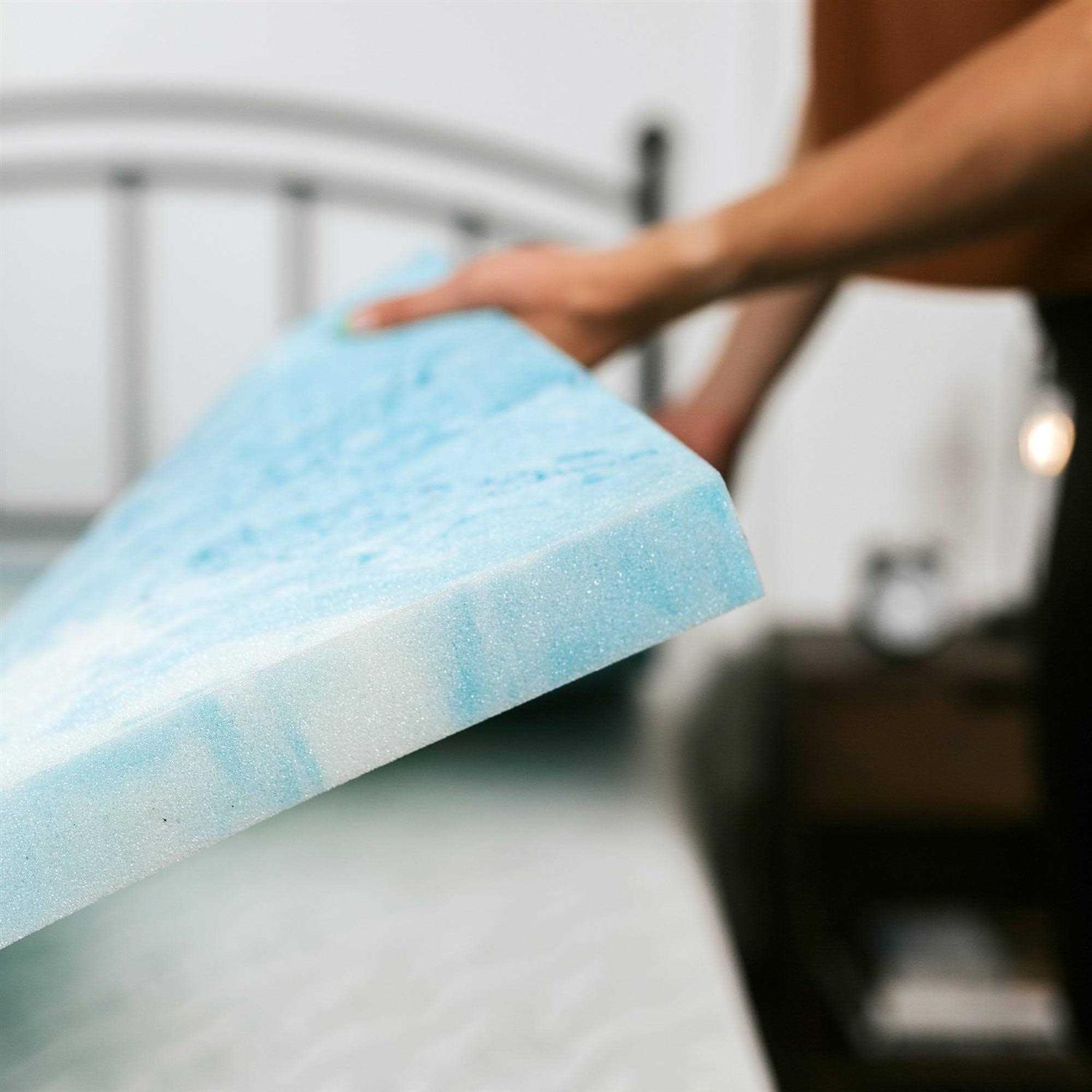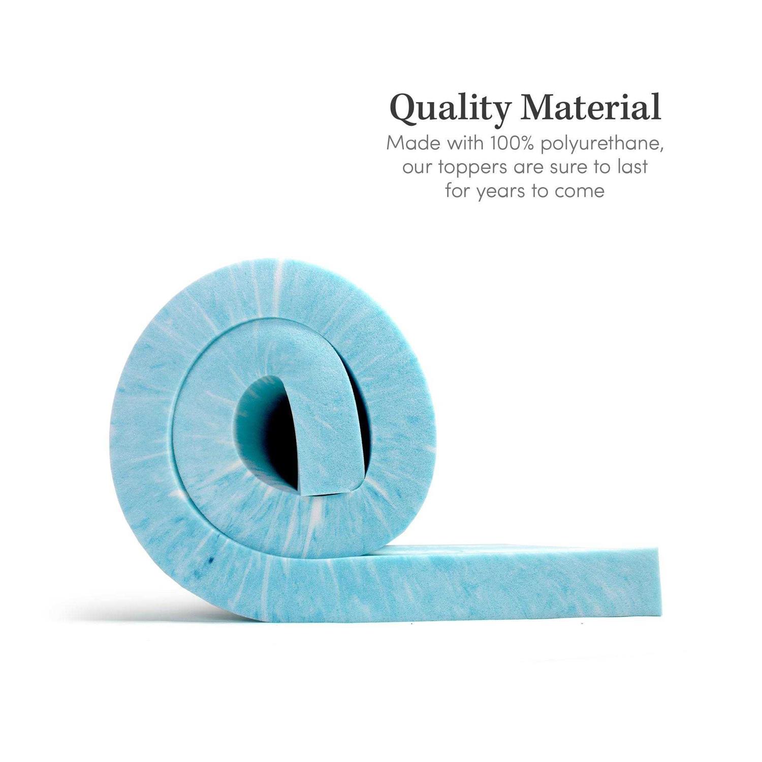 Elastic,memory Foam,polyurethane QUEEN SIZE DIMENSIONS – 58″ x 78″ x 3″ | 2 lb density visco elastic memory foam for extra support. Essential for dorms, campers and RV too. PAIN AND SORENESS RELIEF – Relieve hip, back and other pains and sleep comfortably at the same time. Other products claim to relieve pain, but we can prove that our topper reduces pressure by 51%. SUPREME COMFORT – This mattress topper is designed to cradle each of your pressure points with it’s 1.8 lb density support system. FOAM TOPPER – Made from polyurethane this foam topper is made for long term durability. QUALITY GUARANTEED – Customer satisfaction is our top priority, and we want to ensure you love your new product. If you are not completely satisfied, we will work with you to make things right. Mattress Topper – 1.5 Inch Thick Temperature Regulating Memory Foam Mattress Pad