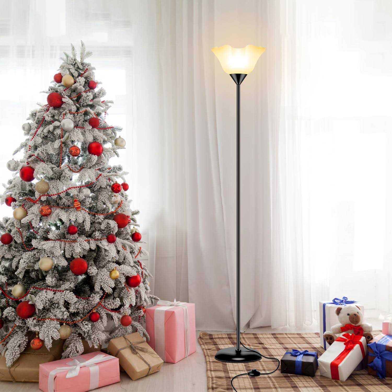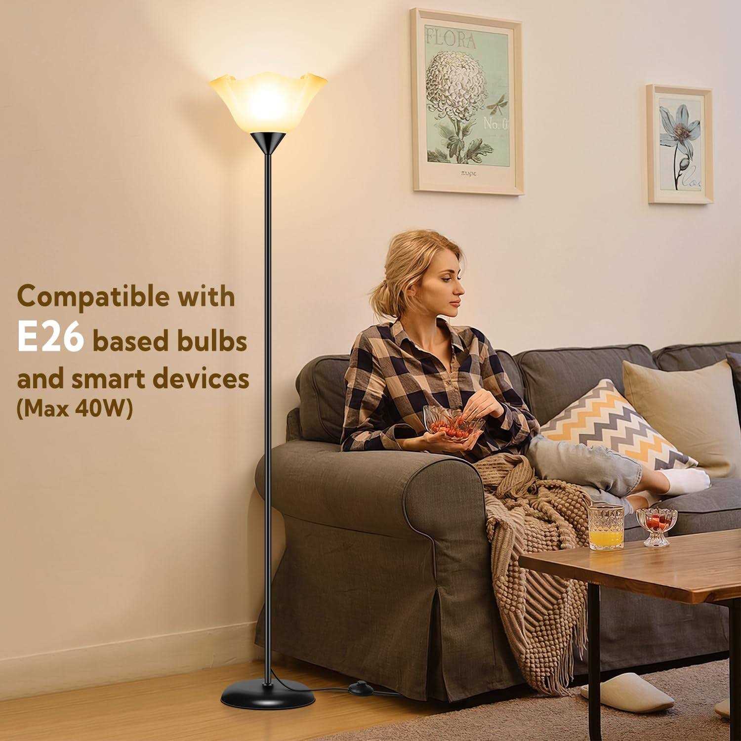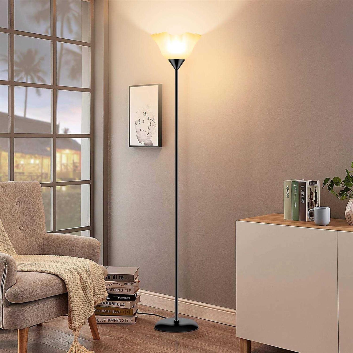Simple and Modern Floor Lamp: Black metal lamp pole, white plastic lampshade, and foot switch make up this high-quality Standing lamp. The simple and modern design of floor lamp is perfect for minimalist home decor. You can place standing lamp in every corner of living room, bedroom, office, classroom, kids room, or dorm rooms. Extra Tall Stand Lamps:74 inch tall standing floor light is suitable for dark corner of bedroom and living room. Uplight torch lamp emits soft light, illuminating the rooms while creating a cozy ambiance. Torchiere floor lamp’s weighted metal base provides enhanced stability, reducing the risk of tipping, especially in areas where kids are present. Floor Lamps for Living Room Clearance Suitable for all E26 bulbs: Stand up lamp includes a 9W LED bulb. Cheap floor lamp can save you at least 8 dollars on E26 light bulb expenses. You can also replace it with other dimmable smart E26 light bulbs to meet your daily lighting needs. Easy to Install and Soft Bright: Simple and easy to assemble without extra tools. Floor lamp has a color temperature of 3000K, providing a soft, warm light that avoids harsh glare, making it ideal for placement behind a couch. A perfect addition to any house, this floor lamp makes for a great gift for your child or family during the holidays. Bulb can be replaced with similar types like smart bulbs. Dimmable, remote-controlled, voice-controlled. This is an affordable yet high-quality floor light.