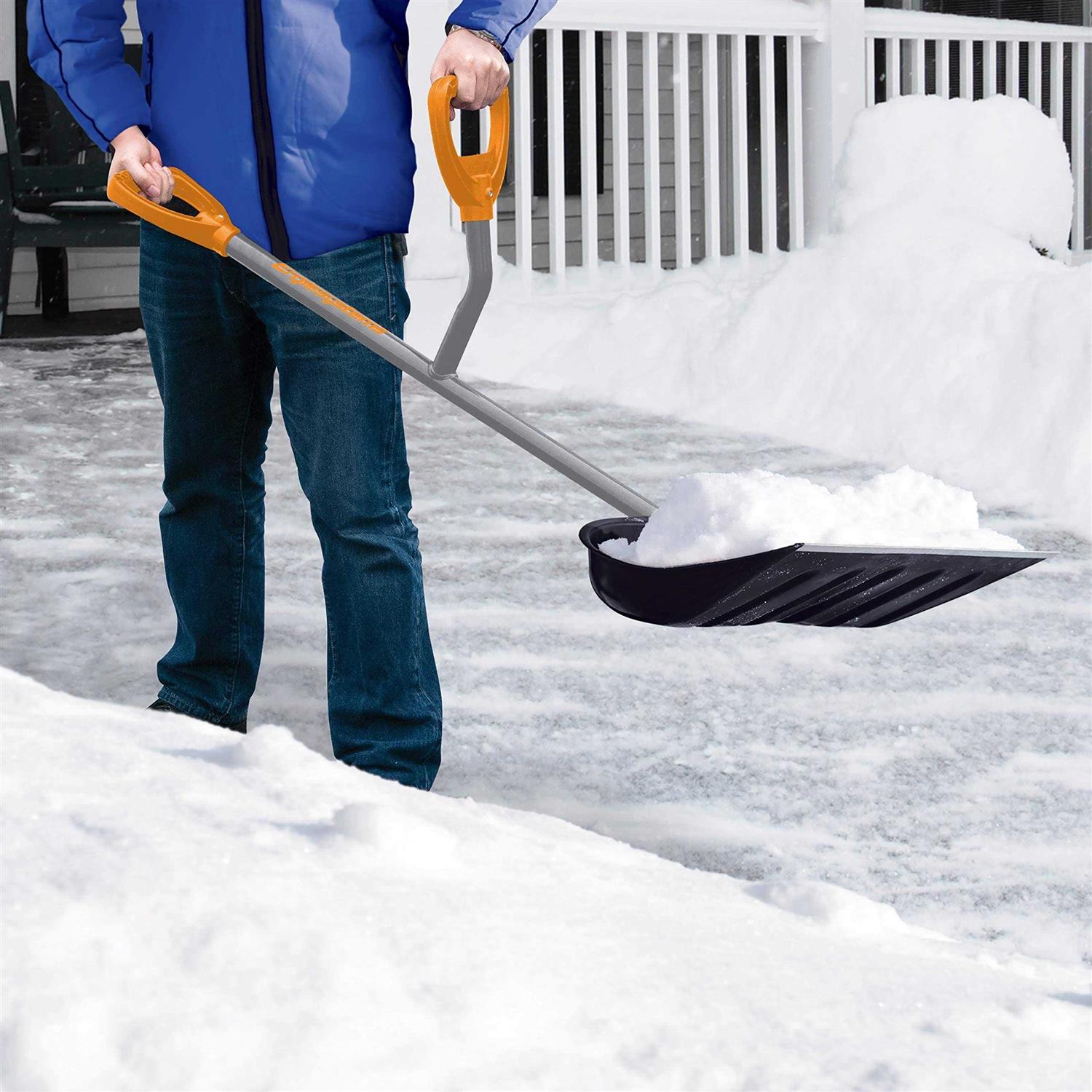 Hard-packed or deep snow takes muscle to move. But you’ll cut the job down to size with this snow shovel that has an extra handle for greater leverage. The wide 18′ blade also lets you shovel more with less effort so you can work longer. Make it easy on yourself. Let it snow, let it snow, let it snow. By Snow Joe.
