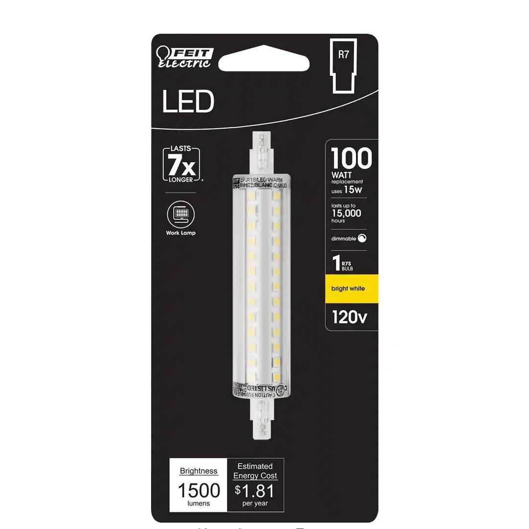 Enjoy all the benefits of advanced LED energy-saving technology with the Feit Electric BP100J118/LED/HDRP 15-Watt R7S Specialty LED Light Bulb. This 3000K bright white light is Dimmable and will replace a 100-Watt equivalent incandescent bulb. It produces a similar light output of 800 Lumens, uses less watts of electricity and up to 87% less energy than a standard incandescent light bulb. Get instant on to full brightness with relatively cool running performance. This Feit Electric LED specialty bulb has an average life of 15000 hours, is RoHS compliant and 100% mercury free. Choose a dependable refrigerator and Indicator bulb for residential or commercial applications.