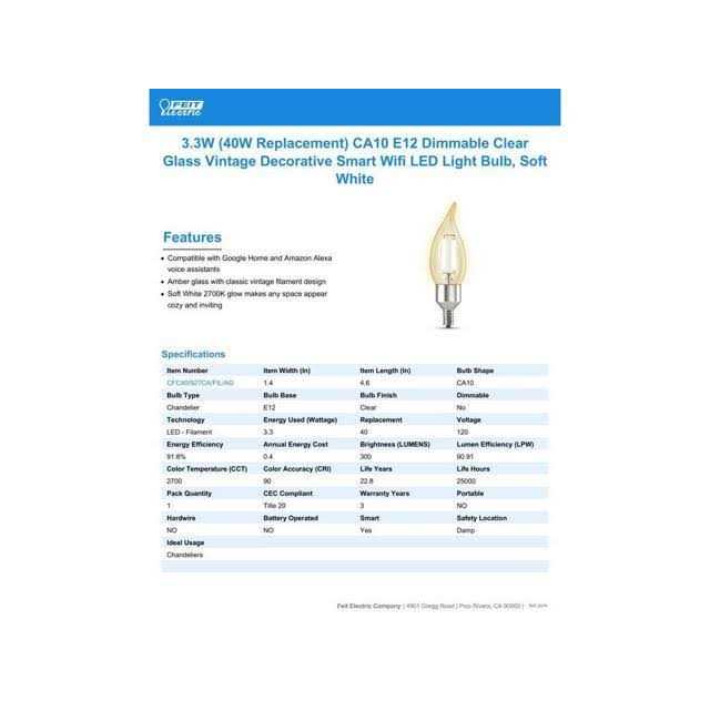The latest in smart lighting technology meets traditional chandelier filament bulb look and feel with the Feit Electric Flame tipped clear glass houses an LED filament to create an upscale vintage vibe, while Alexa and Google connectivity allows lighting control with simple voice commands or an intuitive mobile app. Easily turn lights on/off, dim, set groups and schedules. Set up is simple: The bulbs connect directly to your Wi-Fi at home and can be controlled from anywhere. It has never been easier to customize your homes lighting to suit your lifestyle.