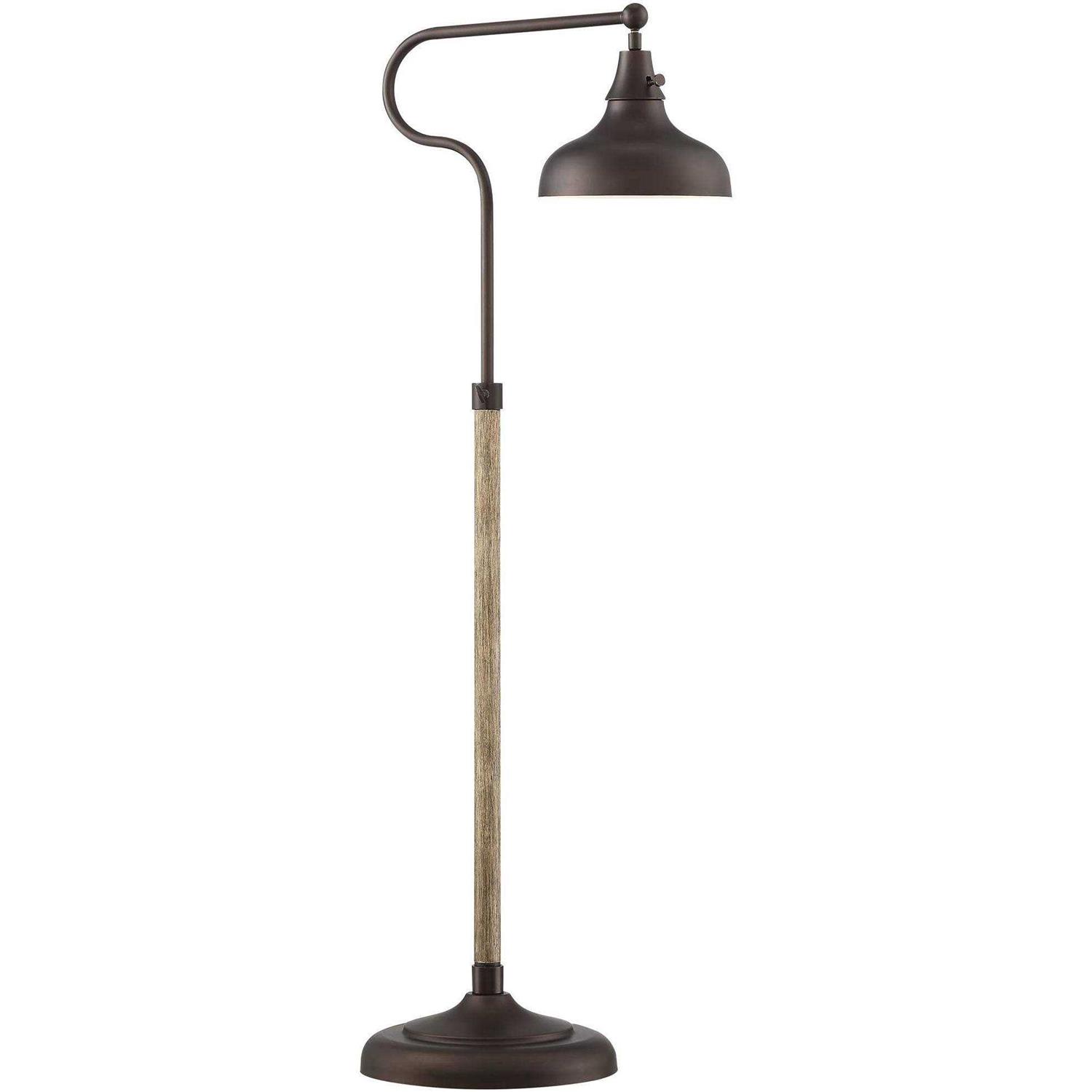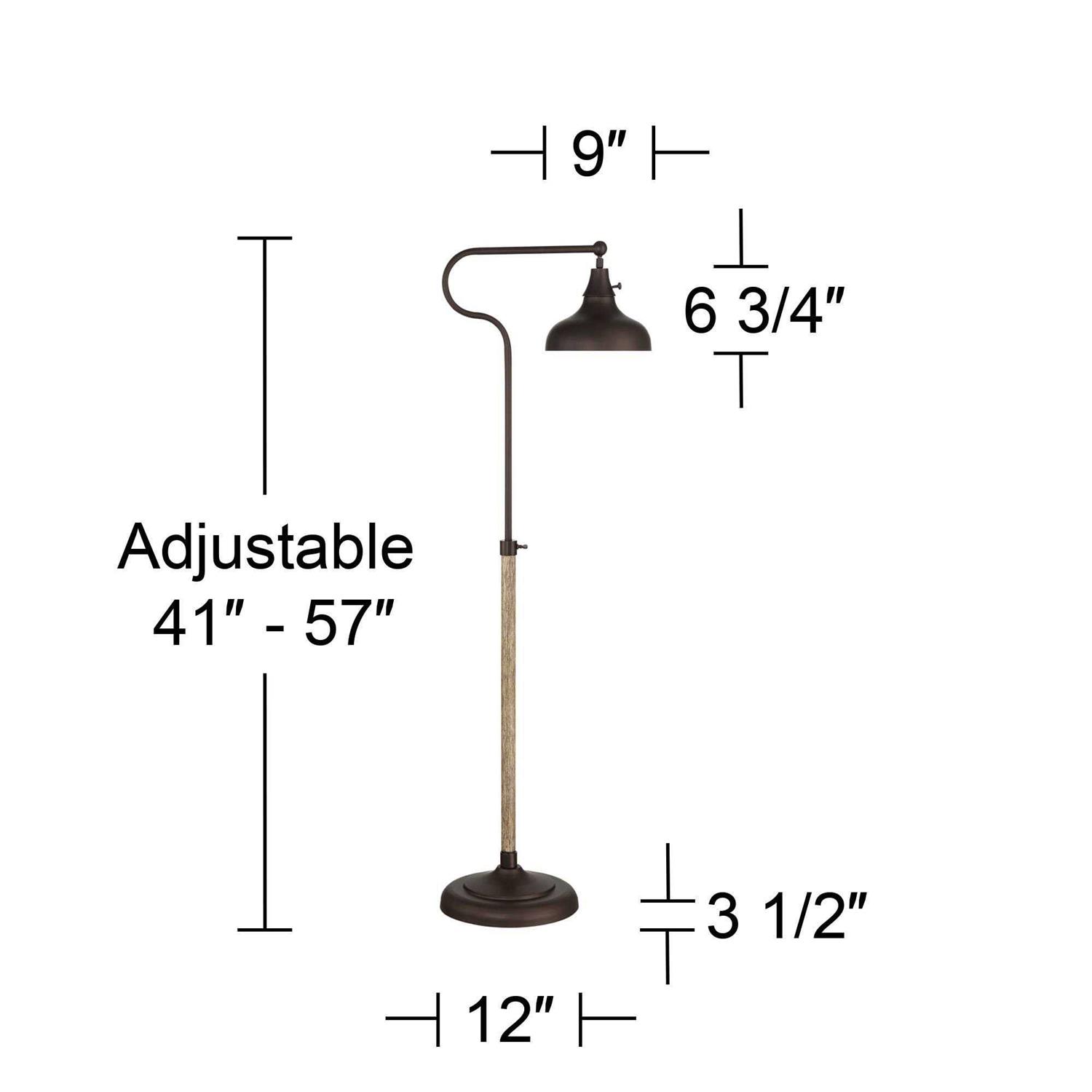 Adjusts from 41″ high to 57″ high overall. Base is 12″ wide x 3 1/2″ high. Shade is 9″ across the bottom x 6 3/4″ high. Weighs 16.5 lbs. Uses one maximum 75 watt standard-medium base bulb (not included). On-off switch located on the shade. Downbridge pharmacy floor lamp from the Franklin Iron Works brand. Inspired by rustic and industrial lighting design. Height adjustable floor lamp design allows you to easily position the lamp for reading or other tasks. Bronze and faux wood grain finishes. Metal construction. 8-foot long brown cord. From the Franklin Iron Works brand, this adjustable downbridge floor lamp is inspired by classic pharmacy styles. Constructed from metal, it features bronze and faux wood grain finishes and a bent arm for a rustic-industrial farmhouse look. The wide metal shade directs light downwards and has an on-off switch located near the top.