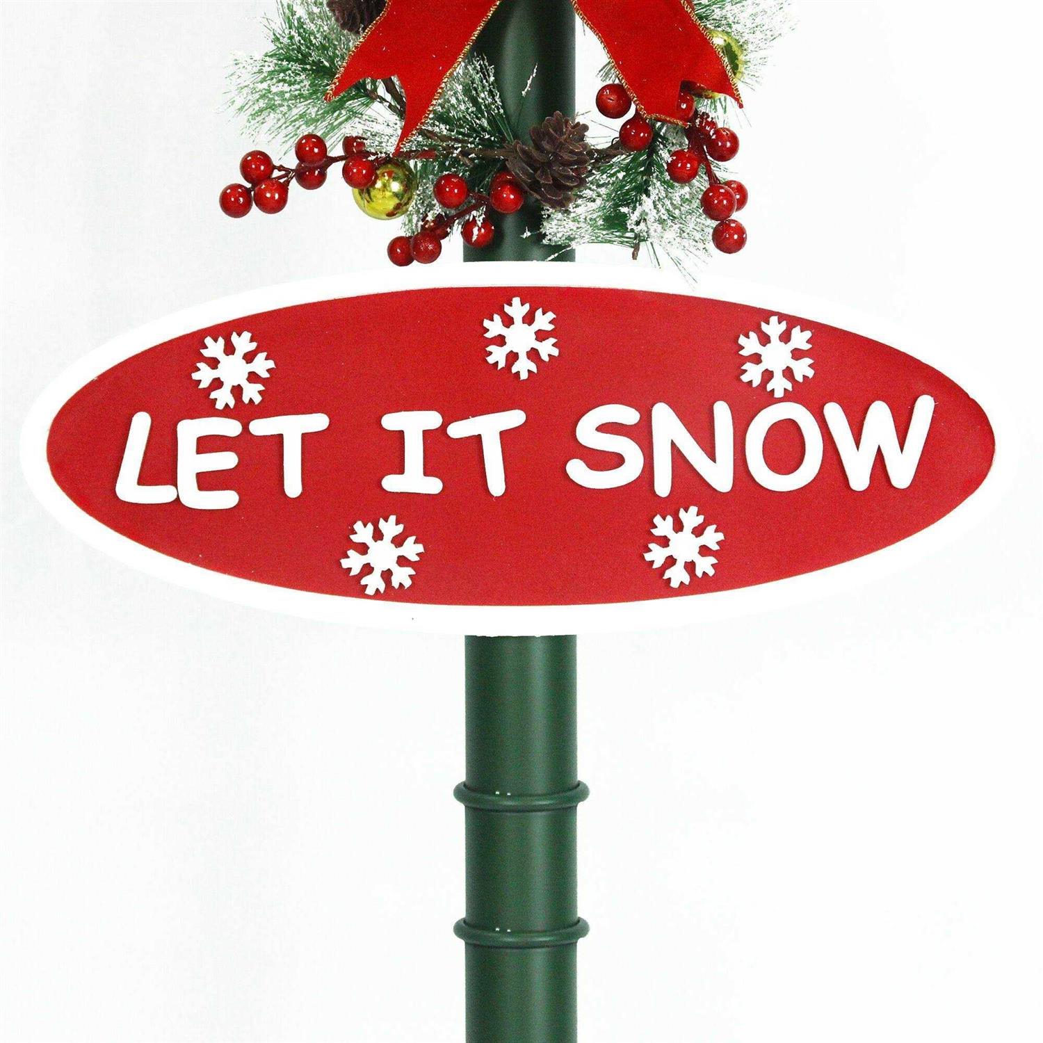 Fraser Hill Farm Let It Snow 71″ Square Street Lamp with Christmas Tree & 2 Signs Animated Musical Décor Greet your guests with this musical street lamp from Fraser Hill Farm’s Let It Snow series, where all products produce flurries of faux snow that fall over a variety of holiday scenes. Watch as brightly lit snow cascades over a Christmas tree scene while your favorite Christmas Carols play in the background. Sing along to 25 family favorites such as Jolly Old Saint Nicholas, The Twelve Days of Christmas, Joy to the World, and many more. The magic of the holidays is truly embodied in this decorative lamp post. With two festive signs, a berry-covered wreath, and a classic red bow, this unique holiday street lamp will help create a magical winter wonderland on your porch, walkway, driveway, or anywhere else in your yard.