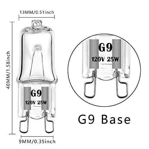 Halogen Bulbs by YBEK. Details:Use High Quality Filament Longer life. You don’t have to change bulbs frequently. Base, Shape and Dimensions Base: G9 2 Pin Bi-Pin with 9mm pin distance Shape: T4 Tubular JC Diameter: 0.511 inches Length: 1.575 inches Please make sure the light bulb base matches what your light fixture has. Please verify your pin distance is 9mm and please make sure the light bulb width and length fit within your light fixture prior to order. Lifetime: 2,000 hours (1.8 years with average of 3 hours use per day) Working with Halogen Dimmers These halogen light bulbs are dimmable using the dimmers designed for incandescent & halogen light bulbs. All incandescent and halogen light bulbs are dimmable using traditional dimmers, as these dimmers simply adjusts the voltage level for dimming. Dimming using LED only dimmers will result in incompatibility, as LED dimmers work very differently.