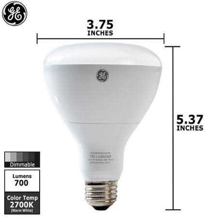 GEL68160 This 10-watt LED BR30 bulb delivers a frosted, white light at the equivalence of a 65-watt incandescent bulb. 120-volt floodlight is designed to last 25,000 hours using 700 lumens. Dimmable, energy-efficient floodlight has been rated at 2,700 Kelvin and has a CRI of 80. Energy Star qualified.
