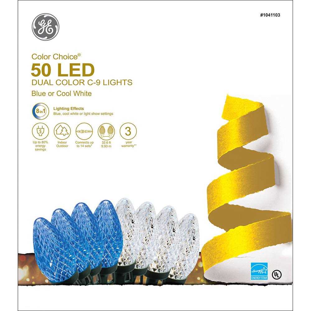 Outline your tree, ceiling, or roof line with the festive GE Color Choice 50 LED Dual Color C-9 Lights Multi Function 32.6 ft Blue/Cool White. These GE Color Choice string lights give you twice the lighting options on a single strand, making them perfect for Christmas, weddings, camping or to light up the patio in the summer. The 8 function control box makes it easy to choose to display a single color, or create a lightshow.Product Details: GE 50 LEDs C-9 Dual color Lights. Energy Star with up to 80% energy savings. Multi Function LEDS use control box to choose blue, cool white or light show. Connect up to 14 sets. Lighted length 32.6 ft (9.93 m). 8 inch between each light. Indoor/Outdoor Use. Energy Star. Total Wattage 8.4 Watts.