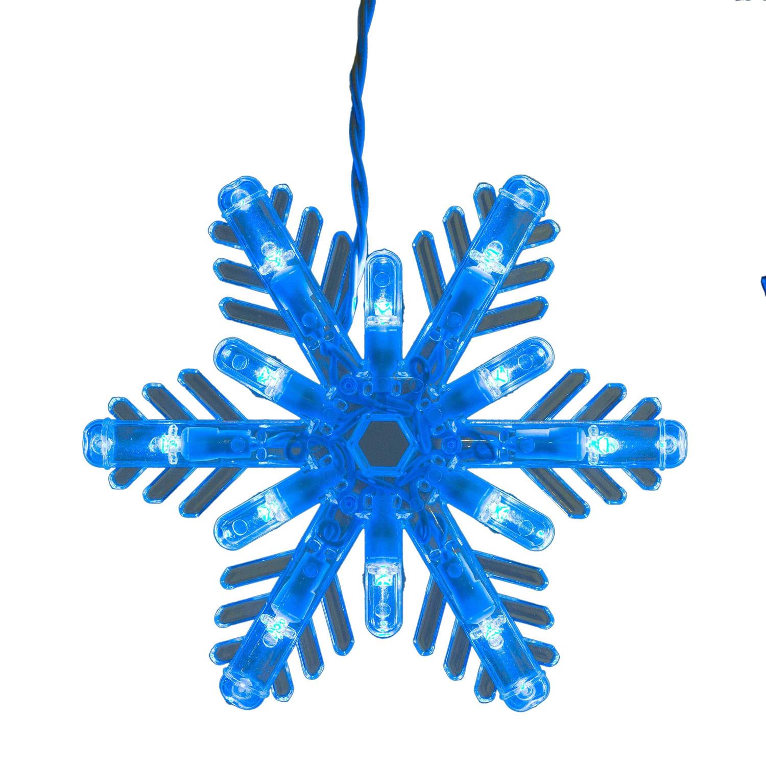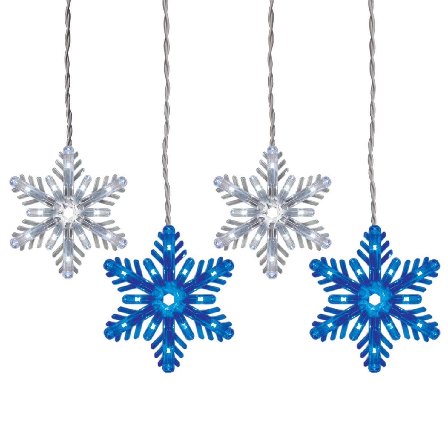 Use the control box to choose between blue, cool white, or light show settings. 7-Inch snowflakes, 12-inch lead wire, 12-inch spacing, 3-inch coaxial end connector plug, 7-feet lighted length, and white cord set.