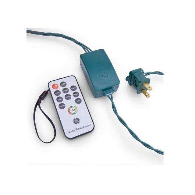 GE Color Effects LED C9 faceted 50-count RGB light set. Use the remote control to choose between 7 colors, 53 functions, and 8 operating modes with sync for a color changing light show. 24-Inch lead wire, 8-inch bulb spacing, 4-inch end connector, 32.6-feet lighted length, and green cord set.