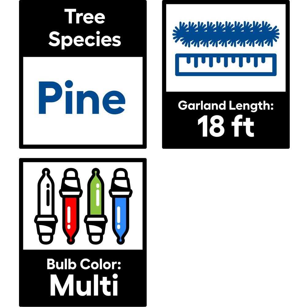 GE 18-foot illuminated artificial garland pre-lit with 50 StayBright LED 5.5mm traditional miniature multicolor lights. 3.5-Inch diameter and green cord set with end connector plug.