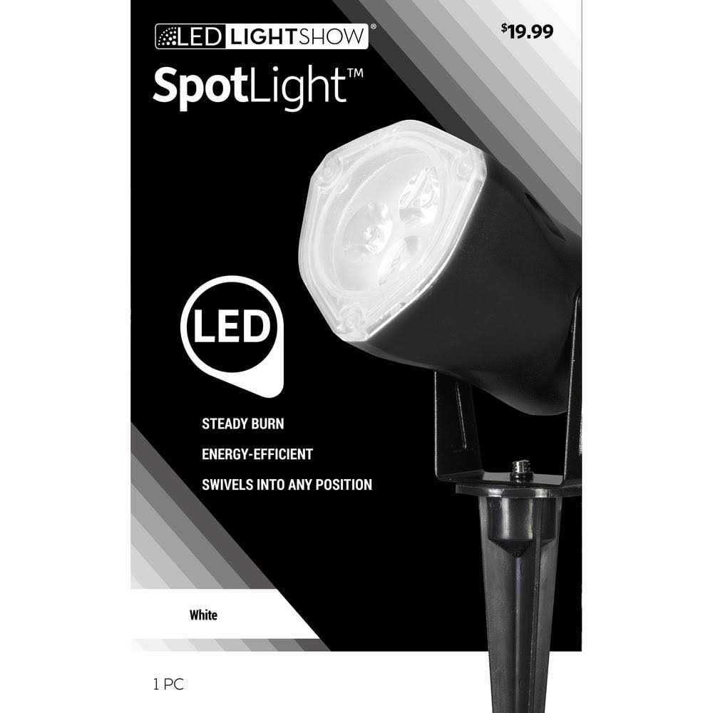 LightShow Light up the holidays with the Gemmy Christmas Lights LED Spotlight. This Christmas decoration tool is mean to be used for outdoor use. The LED white spotlight Christmas light also is available in two other colors. This product can be a suitable tool for accenting your home or other outdoor decorations. Set up the yard with an entire scene and showcase it at night with this white light. The Gemmy light is easy to use, the light is attached to a stake that goes into the ground. Then, plug the light into an outdoor outlet.