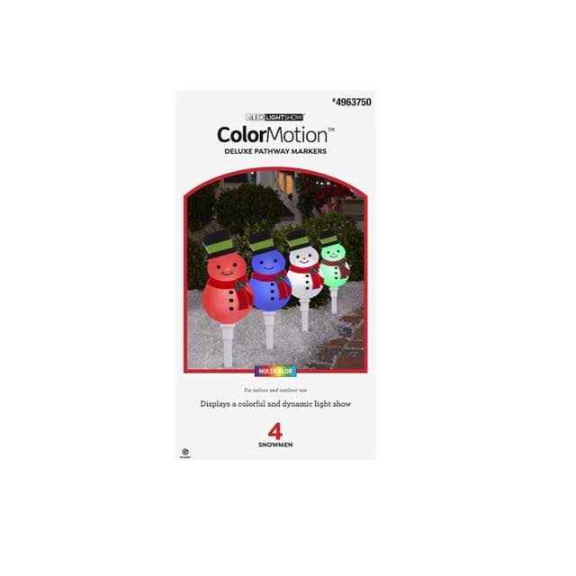 Light up a walkway or landscaping with LightShow ColorMotion Deluxe Pathway Stakes! These amazing holiday lights feature four snowmen with spectacular lighting effects. Perfect for lining sidewalks, landscapes or any outdoor area. The pathway markers stake easily into the ground and deliver a colorful light show. Displays a dynamic, colorful light show with multiple effects. Connect up to 18 sets end to end. Includes 7.5-ft electrical cord, requires outlet for plug in, ETL Listed. Perfect for any indoor or outdoor location where you enjoy Christmas lights. Total Length 7.5ft, Lighted Length 6ft.