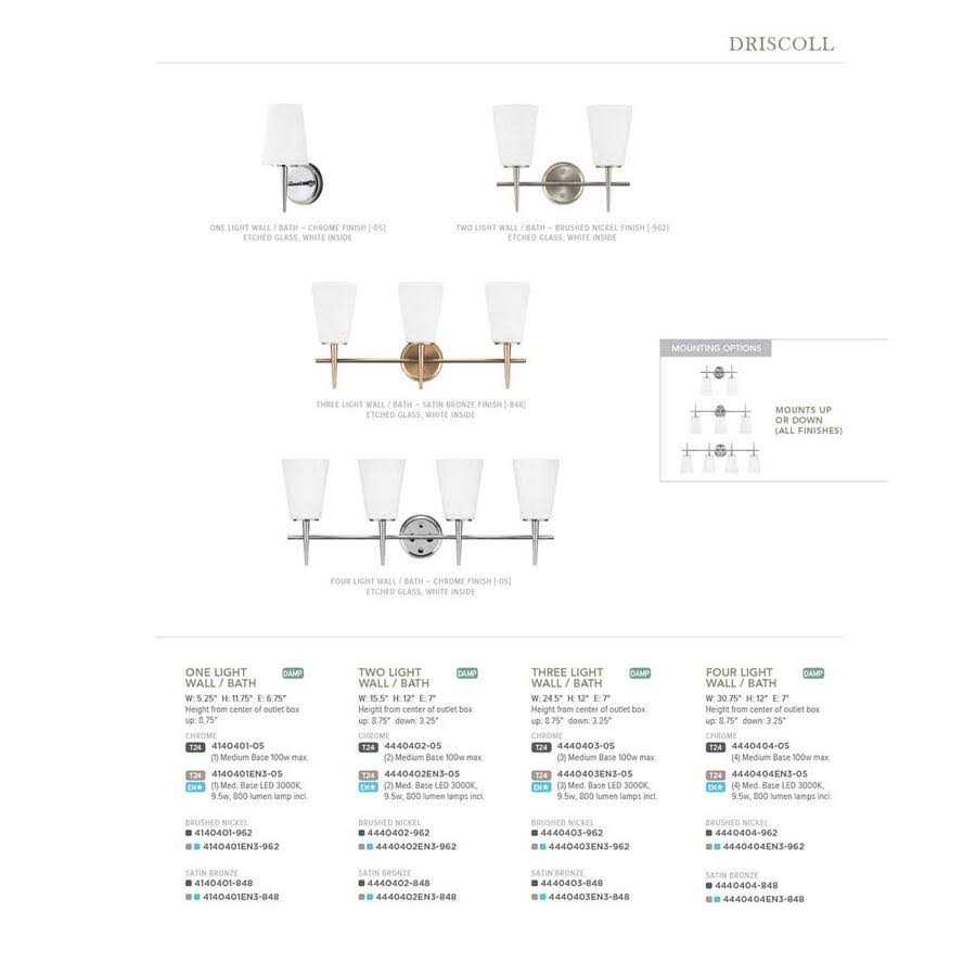 The 1960? s-inspired Driscoll collection by Sea Gull Lighting features the clean lines of tapered stems and glass shades. Simplicity combined with sophistication creates this strikingly modern look. Offered in a Brushed Nickel finish in addition to the Chrome finish also offered for wall/bath fixtures all of which feature Etched White glass shades. The assortment includes nine-light, five-light and three-light chandeliers, a mini pendant, as well as one-light, two-light, three-light and four-light wall/bath fixtures. Both incandescent lamping and ENERGY STAR-qualified LED lamping are available; all fixtures are California Title 24 compliant.