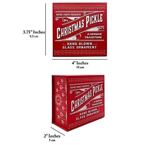 Includes 1 Hand Blown Glass Pickle with gold toned hardware. Comes in a gift ready box with magnetic closure and includes the story of the Christmas Pickle on the inside. Pickle is 3.5” Tall. Enjoy the magic of Christmas this year with this Hand blown tree ornament. This traditional german custom is great for kids, children, and adults or anyone who feels the spirit of St. Nicholas. Each brilliant green ornament has a gold toned topper and gold shimmering string. Perfect for hanging on any pine tree, mantel, or perfect for gift giving. Each of the ornaments come in a decorative gift box ready for giving. Each red giftbox is decorated in classic German decor and evokes the feelings of the old times. Inside the box you will find the legend of this gherkin. The idea is that by placing this bobble on one of the trees on Christmas eve, it allows children to spend time looking at all the beauty of the tree and it’s decoration while they search for the hidden pickle. Instead of just tearing open their gifts first thing on Xmas morning. Great for anyone looking to acquire some special family traditions or adding some special flair to Saint Nick’s routine! Add a little extra decor to the preexisting decor. Perfect for Secret Santa or gift swaps. Includes 1 Hand Blown Glass Pickle with gold toned hardware. Comes in a gift ready box with magnetic closure and includes the story of the Christmas Pickle on the inside. Pickle is 3.5” Tall.