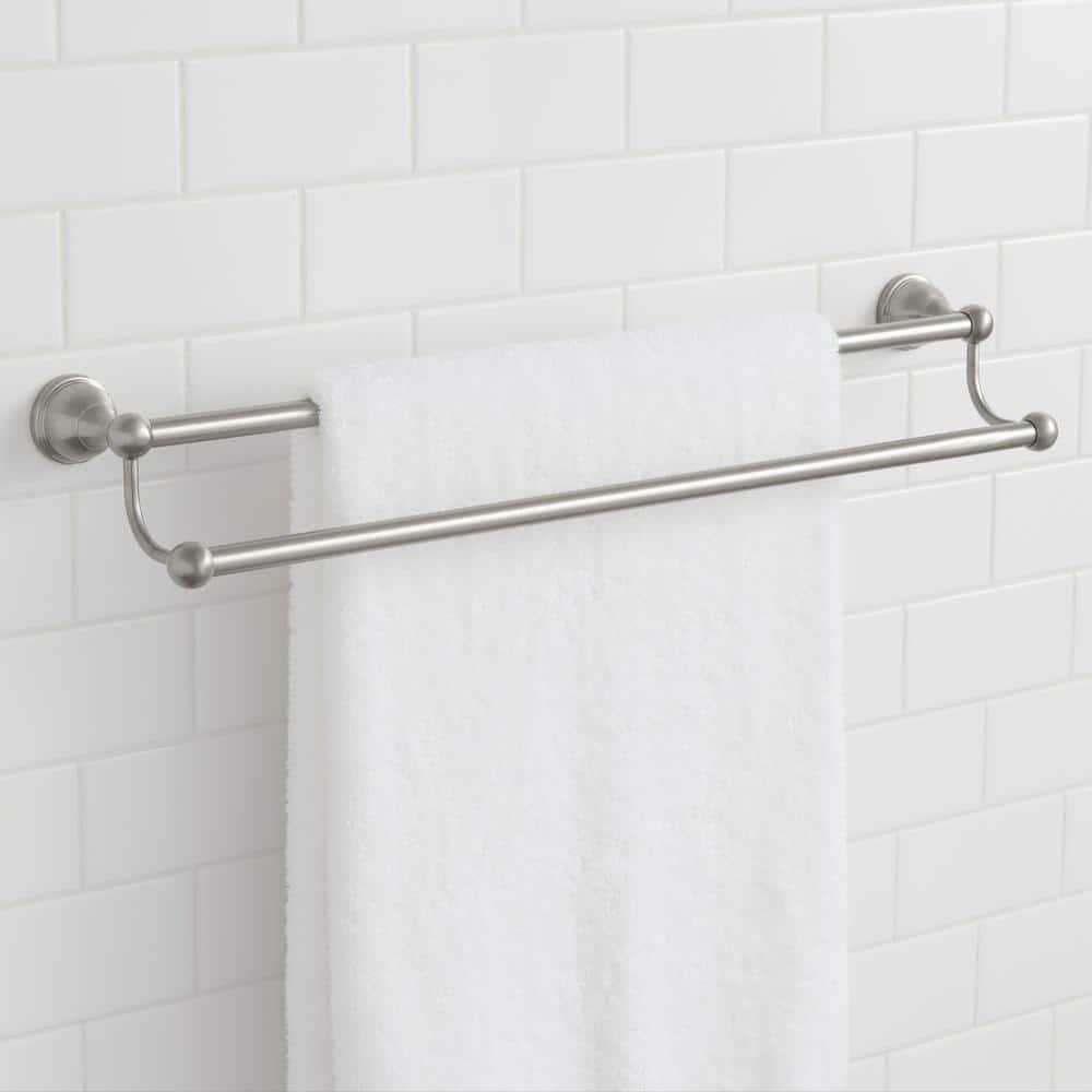 Double Towel Bar in Brushed Nickel has a sophisticated design and brushed nickel finish that will provide instant elegance and functionality to any bath or powder room decor. Durable and sturdy with aluminum construction, this towel bar is easy to install with mounting hardware and plastic anchors included. Coordinate with other brushed nickel pieces from the Mandouri Collection to give your decor a polished and pulled-together look that is as functional as it is beautiful. Brushed nickel finish will complement a wide range of decor styles Durable aluminum construction Easy to install. Features24 in. Double Towel BarBrushed NickelDurable aluminum construction. Double Towel Bar in Brushed Nickel has a sophisticated design and brushed nickel finish that will provide instant elegance and functionality to any bath or powder room decor. Durable and sturdy with aluminum construction, this towel bar is easy to install with mounting hardware and plastic anchors included. Coordinate with other brushed nickel pieces from the Mandouri Collection to give your decor a polished and pulled-together look that is as functional as it is beautiful. Brushed nickel finish will complement a wide range of decor styles Durable aluminum construction Easy to install.