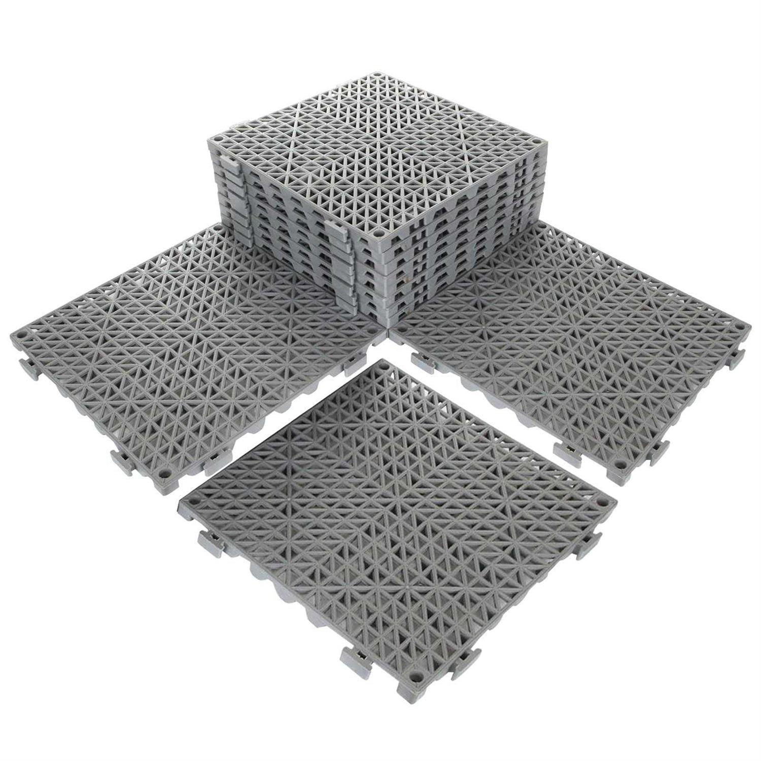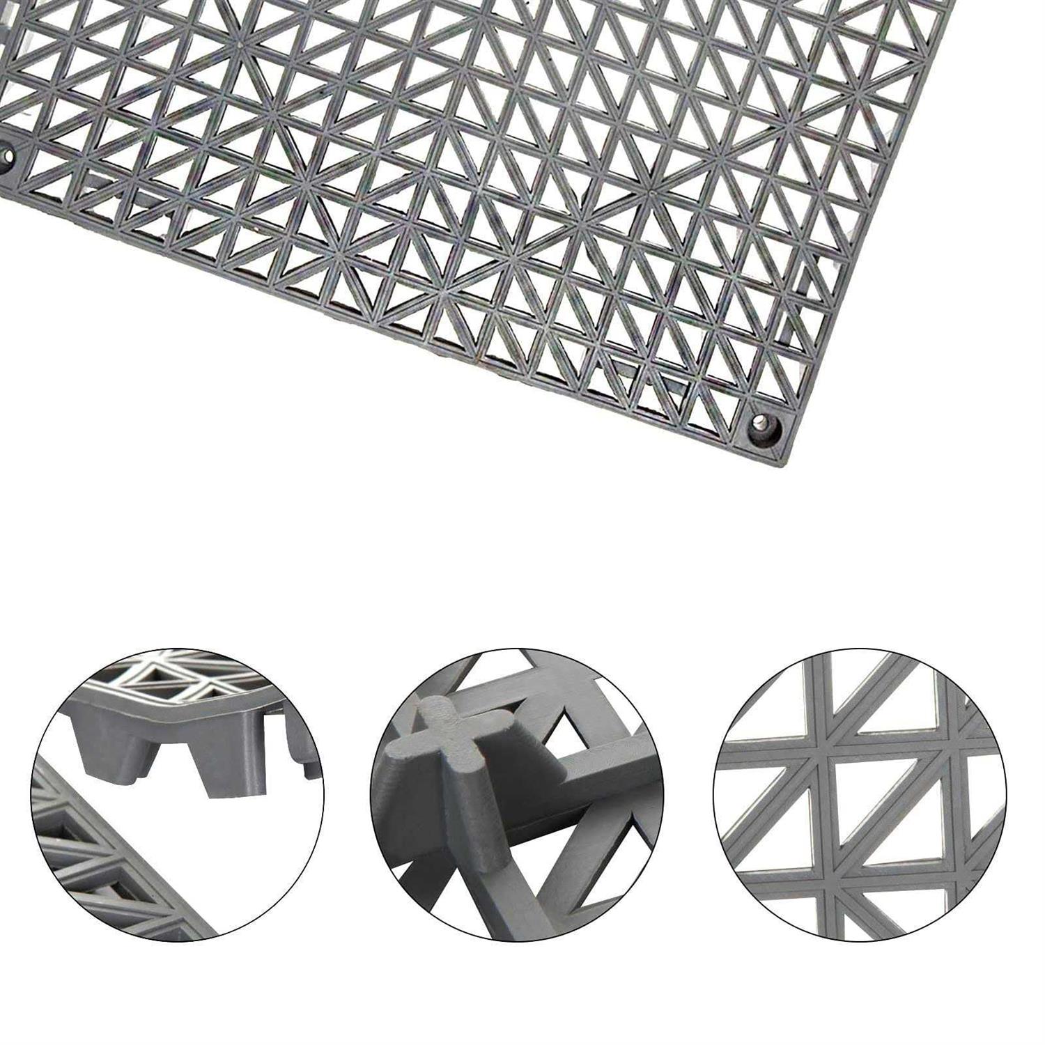 12 PCS INTERLOCKING CUSHION TILE: Multifunctional modular interlocking flooring tiles mat is excellent choice for any wet of damp area; Perfect for placed in the bathroom and pool to prevent falling due to slippery. SAFETY AND : The interlocking cushion tiles are made of high quality soft PVC material, premium quality provides safety and non-toxic performance to ensure long time use. Good flooring solution to apply on pool, bathroom, boat deck and any wet area. UNIQUE DESIGN: The waffle surface design has strong drainage feature for wet area which is safe and anti-skid and helps to prevent slipping and falling. Thicken design to raise foot traffic above wet floors, can be keeping your walking surface safe and dry. EASY TO INSTALL: 1. Put each floor drainage mat in the same direction; 2. Lock in the floor mat one by one; 3. Cut off the excess parts with scissor; 4. Complete and enjoy the floor mat in the wet area. Special features: anti-slip GLEEJON 12PCS 12 x 12 Inch interlocking flooring drainage tiles mat to prevent slipping and falling in wet area, good flooring solution for pool, bathroom, pet area and more MOST POPULAR USE OCCASION -Swimming Pool -Bathroom -Balcony -Toilet -Bathhouse -Kitchen -Any Wet Area ADVANTAGE OF INTERLOCKING CUSHION MAT -Safety and Anti-Skid -Avoid Slipping and Falling -Easy to Install and Clean -Quick Water Drain -Widely Use Indoor and Outdoor SPECIFICATION OF FLOOR DRAINAGE MAT Material: Soft PVC Color: Grey Design: Drain Hole Size: 12inch x 12inch Package Included: 12pcs Interlocking PVC Flooring Tiles Mat