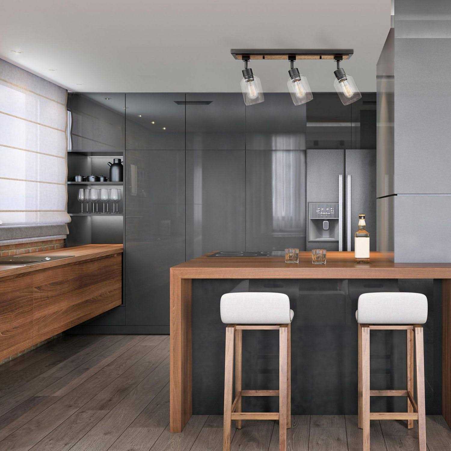 Globe Electric Griffith 25 inch 3-Light Faux Wood and Matte Black Track Lighting with Clear Glass Shades, 59798
