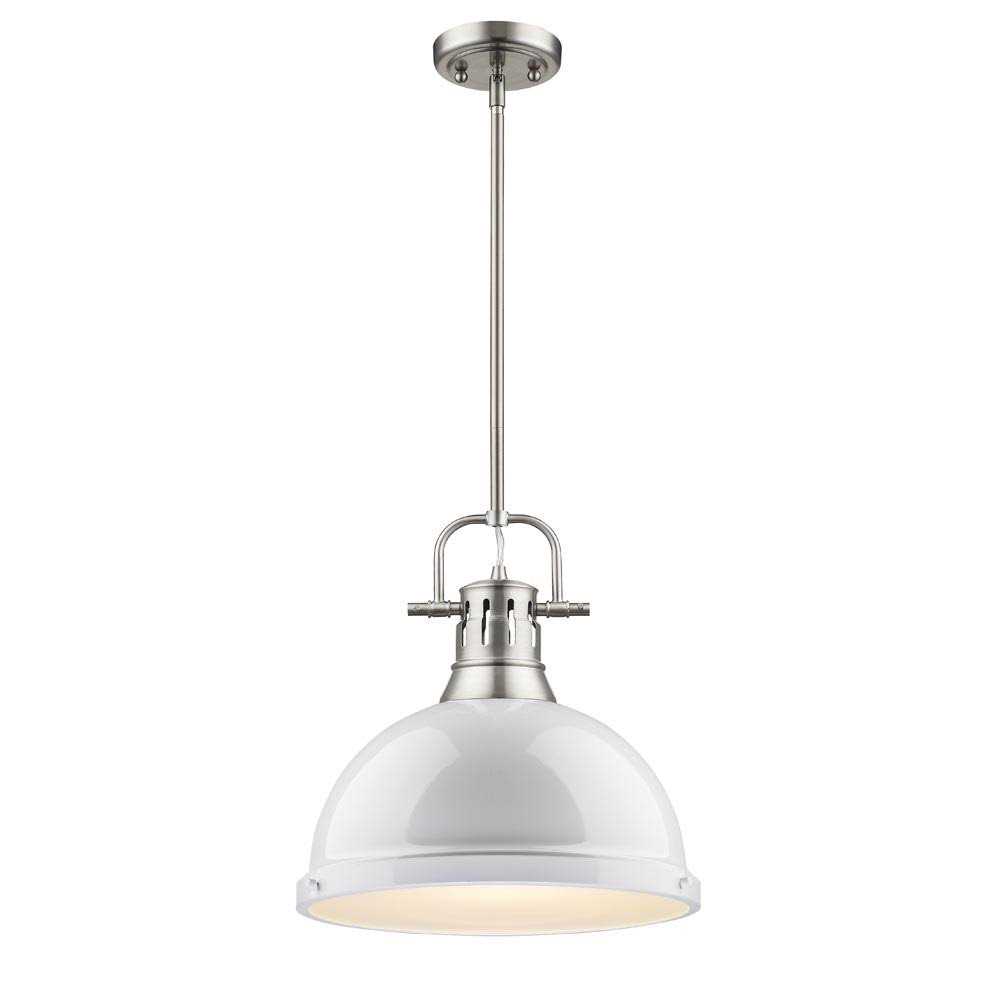 The Duncan collection is contemporary style with an industrial feel. The collection features a variety of simple, traditional silhouettes that are a nod to a bygone era. Transform the look of your room with these classic, vintage-inspired fixtures. A variety of plated and painted metal shade finishes are offered in choice combinations. This large, rod-hung pendant features a glass diffuser and is comfortably sized for a small nook or island. The pendant may be hung individually or grouped over a bar.