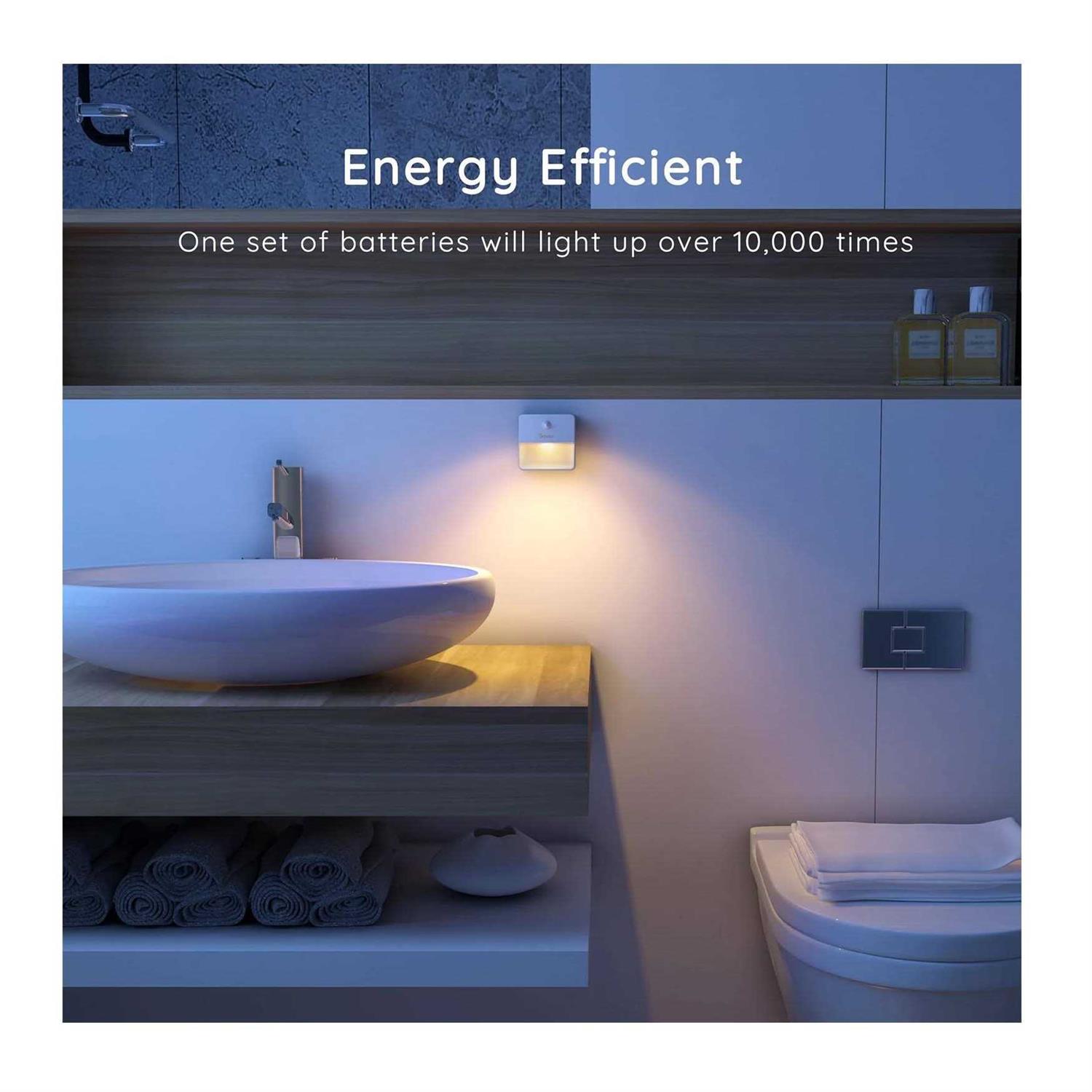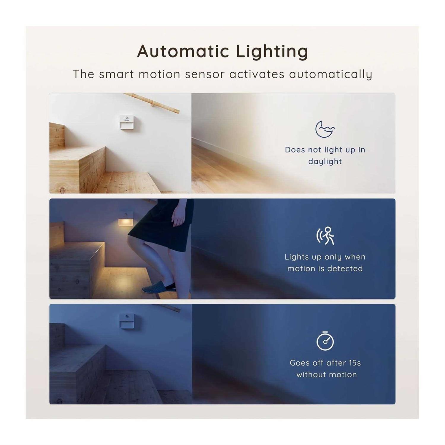 Features: These motion sensor night lights provide downward, eye-friendly light. Install them anywhere and enjoy guiding lights that know when and where you need them. Wide angled lighting from a compact, energy-efficient night light.