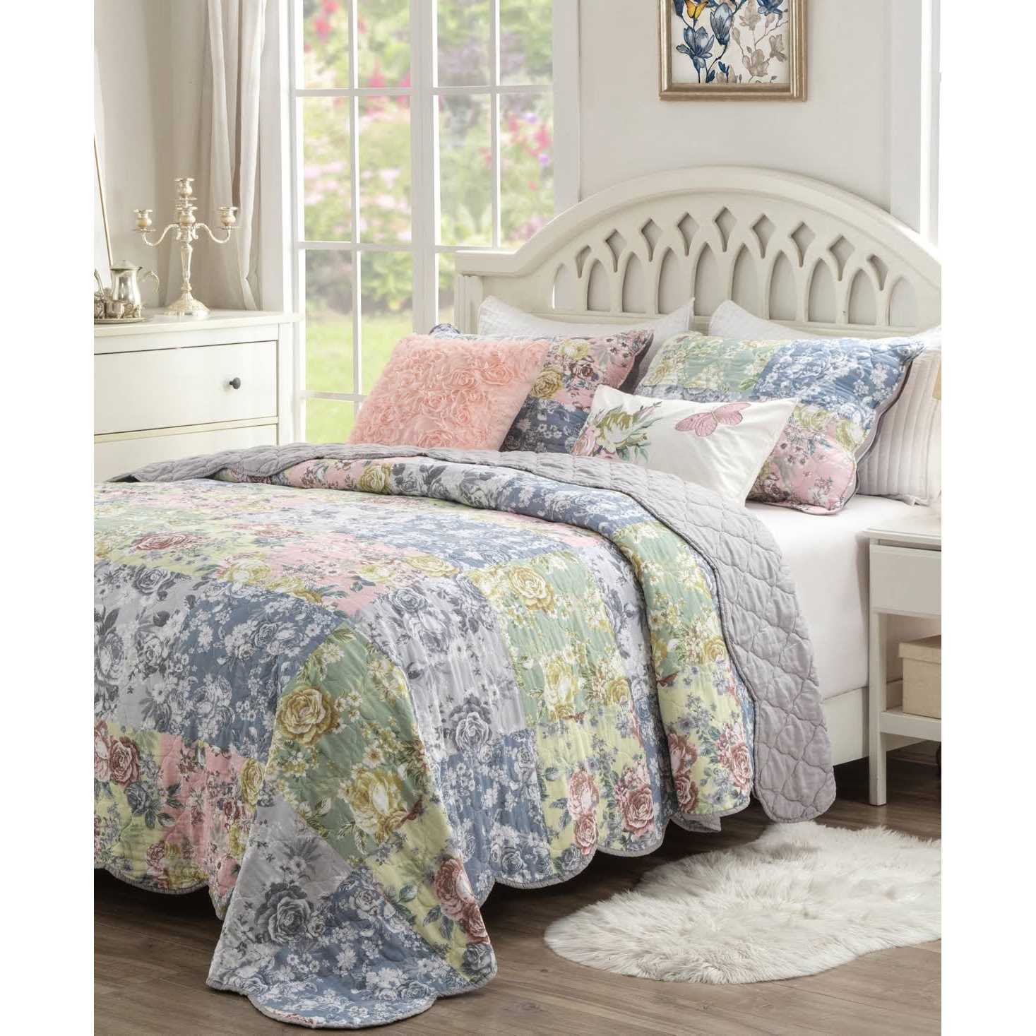 Our Deborah Quilted Bedding Set, takes inspiration from timeless farmhouse design, made with modern quality and attention to detail. This quilt set makes a beautiful and elegant way to update any bedroom. The patchwork design adds beautiful, soft pastel hues to any bedroom. Vermicelli quilting offers rich surface texture and durability. The quilt is reversed by a neutral gray design, giving you two looks in one! The quilt set includes a quilt and two shams (one sham per twin size). Made from 100% cotton face, with a microfiber polyester back and cotton rich fill. Quilt is machine washable for easy care, perfect for homes with pets or children. Imported.
